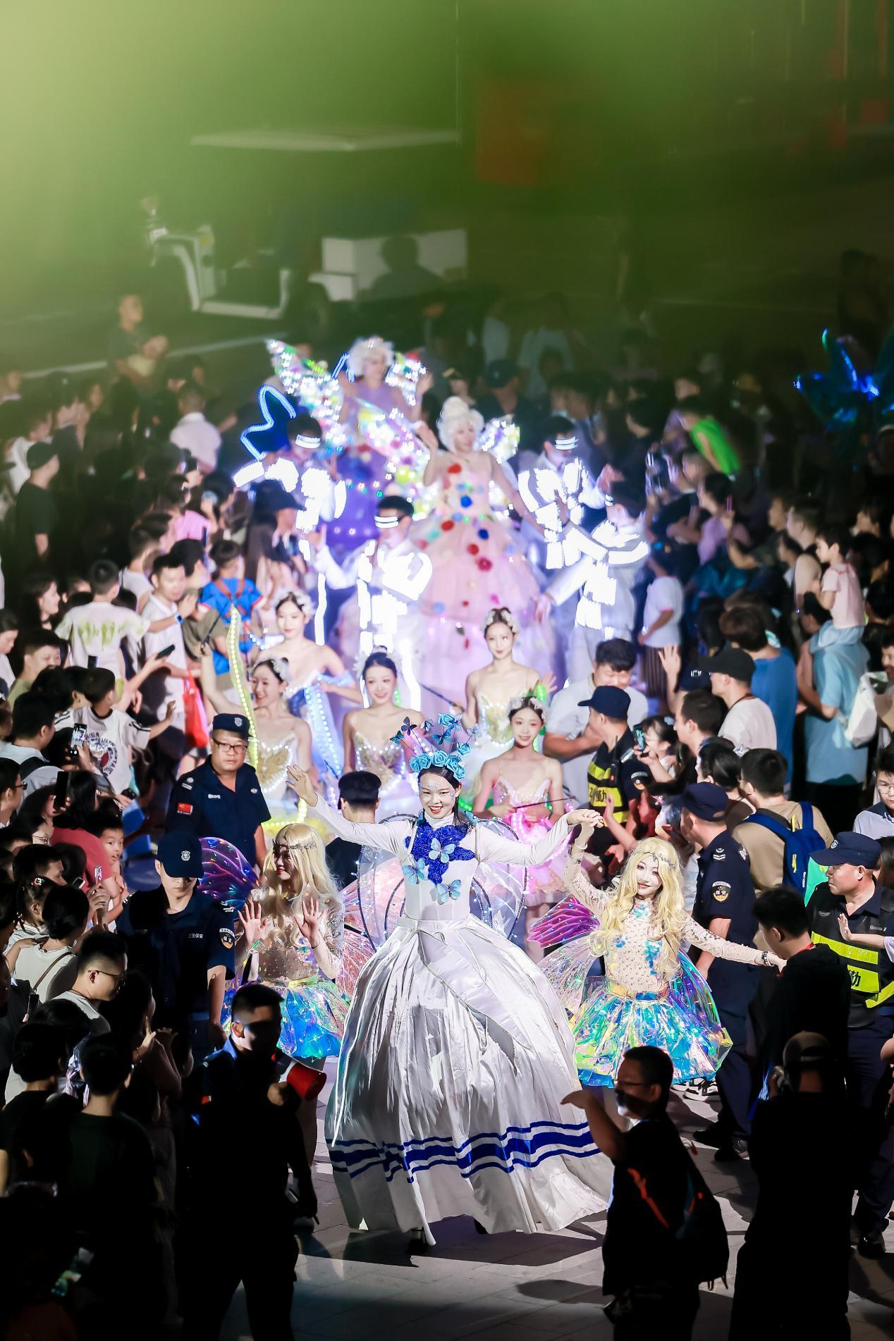 南广场“虹动拾光・跷影舞聚”则通过荧光服饰舞者、高跷NPC与冷焰火效果,在夜色中编织出一场梦幻夜光派对,市民游客与“虹光精灵”互动合影,笑声与歌声回荡夜空。