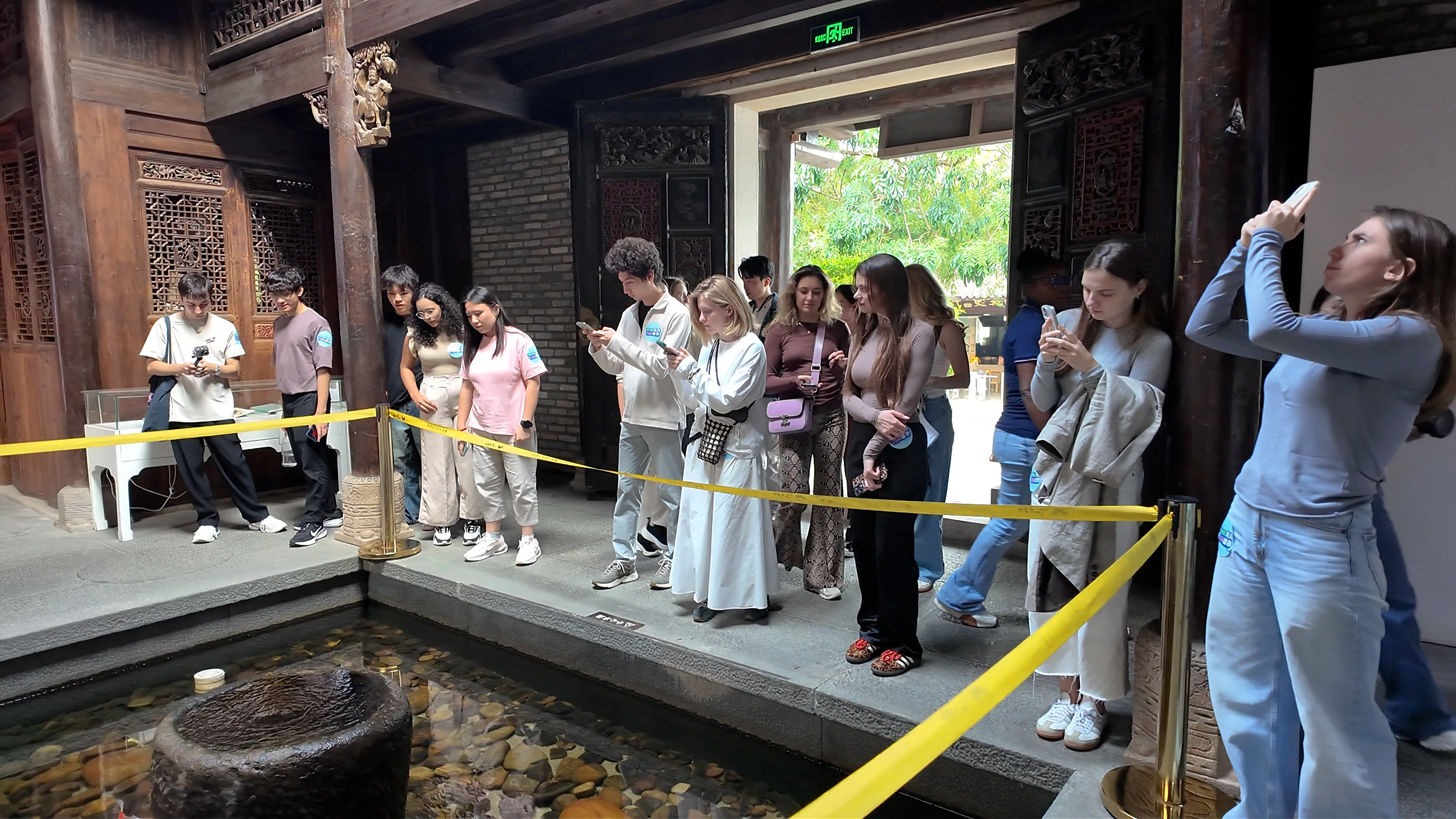 从绚烂的艺术世界与炫酷的科技空间走出,留学生们来到宁静古朴的甘坑古镇。踏上光洁的青石板路,时光仿佛悄然放慢;黛瓦青砖的围屋、精致的木雕窗棂,无声诉说着客家建筑的岁月故事。