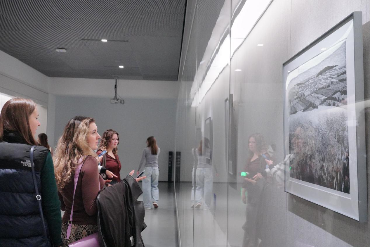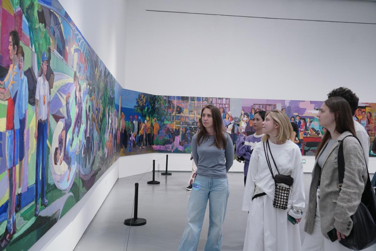 旅程的首站——大芬油画村,就足以让所有人为之“Wow”出声!步入大芬美术馆,艺术的多元面貌徐徐展开。《流动的秩序》大芬美术馆典藏版画精品展,以严谨的版画技法展现流动的创造力,诠释了艺术中规则与自由的平衡。而真正带来视觉震撼的,是那幅描绘深圳腾飞史的《奇迹》百米油画长卷。作品以恢弘笔触勾勒深圳45年发展历程,从大鹏湾的晨曦到前海的浪潮,将城市变迁浓缩于方寸画布之间。留学生们沿画卷缓步观赏,在色彩与构图中阅读一座城的成长史诗,真切触摸“深圳速度”的温度与厚度。