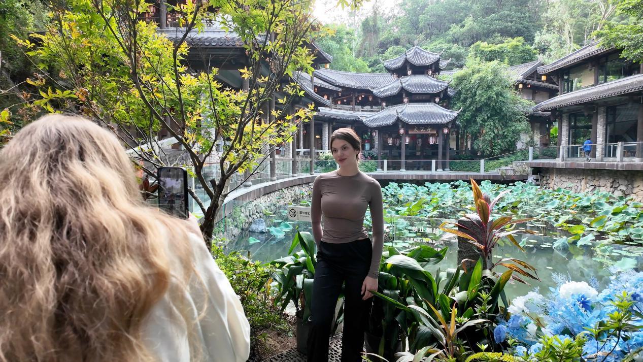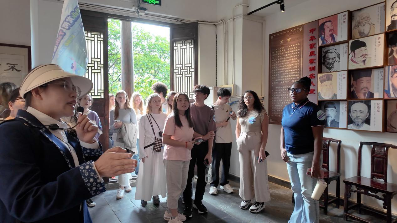 此行的最后一站,是隐于古镇山水之间的二十四史书院。作为全国首座围绕“二十四史”这一国家级IP打造的文化地标,其典雅别致的园林建筑,俘获了所有人的心。漫步亭台楼阁、小桥流水间,留学生们纷纷化身“拍照达人”,驻足留下倩影。