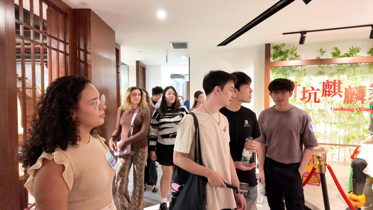 在甘坑家风家训馆,留学生们认真品读家风家训的经典故事和名言警句,在“孝悌忠信”的古老训诫中领悟中华文化中关于家族传承的厚重底蕴。随后,他们来到甘坑展览馆,开启了一场“客家文化探寻之旅”。馆内陈列的凉帽、蓑衣、农具等老物件,生动勾勒出客家人勤劳智慧的农耕图景;而舞麒麟等特色民俗展示,更让留学生们直观感受客家文化的鲜活热闹。“看到这些陈列,就能联想到客家人民当时的生活场景,非常有意思!”来自俄罗斯的留学生如是说。