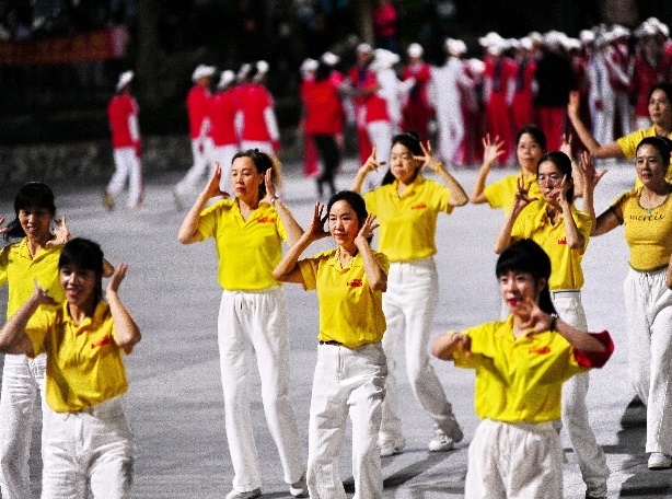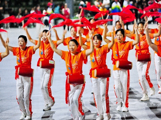 铿锵的传统韵律余音未落,随后登场的是充满现代气息的群众舞蹈展示。健身操《信天游》节奏欢快,动感洋溢;广场舞《一饮醉山河》与《潇洒走一回》舞姿翩跹,韵味十足;佳木斯队伍则以《没有共产党就没有新中国》《边疆的泉水清又纯》两首经典曲目,将现场气氛再次推高。队员们动作整齐划一,以饱满的热情和昂扬的状态,展现出健康向上的精神风貌。
