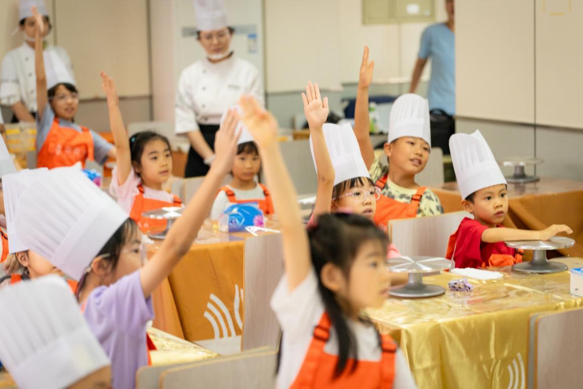 在财商实践课上,烘焙老师先介绍了制作蛋糕的步骤、进行有奖抢答,小朋友们踊跃回答,都赢得了兑换材料的“货币”。小厨师们“购买”原材料,戴上厨师帽、手握奶油抹刀,小心翼翼地抹奶油、裱奶油花,最后摆上水果,完成蛋糕制作。因为奶油和水果都有限,小厨师们必须努力赚到“本金”,“合理消费”购买材料,“谨慎投资”奶油、水果,才能做好自己的“蛋糕”。