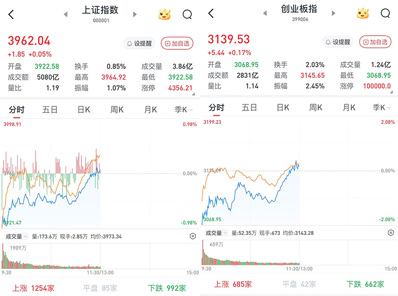 至午间收盘,上证综指涨0.05%,报3962.04点;科创50指数跌0.53%,报1379.94点;深证成指跌0.15%,报13155.62点;创业板指涨0.17%,报3139.53点。