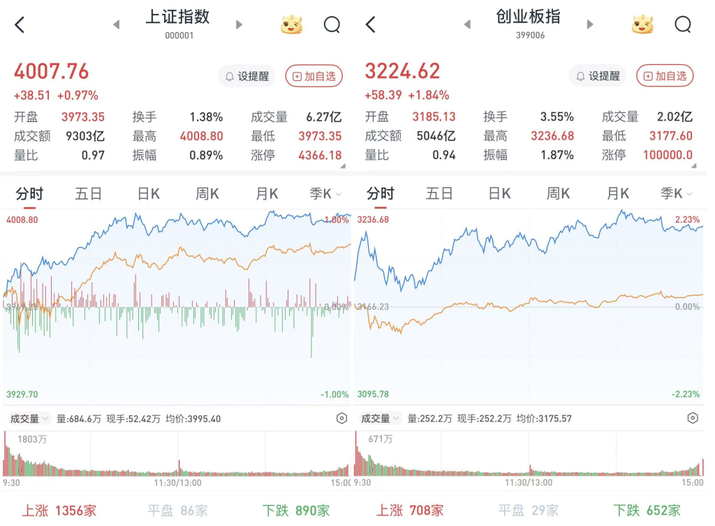 至收盘,上证综指涨0.97%,报4007.76点;科创50指数涨3.34%,报1436.86点;深证成指涨1.73%,报13452.42点;创业板指涨1.84%,报3224.62点。