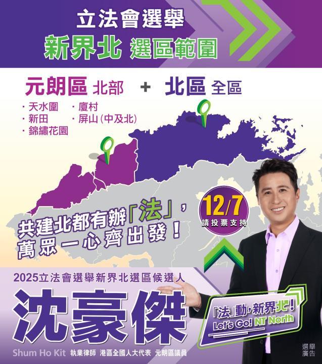 沈豪杰:我这次选举的口号就是“法”动新界北。发动,有两个意思的,因为我们行政长官都说了对于北部都会区的发展心急如焚,虽然这个概念都有了几年了。但是似乎还有很多不同程度的事情令北部都会区的发展未能迅速前进。