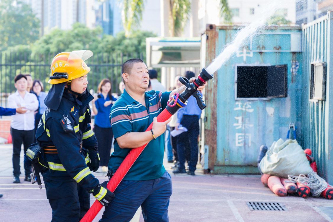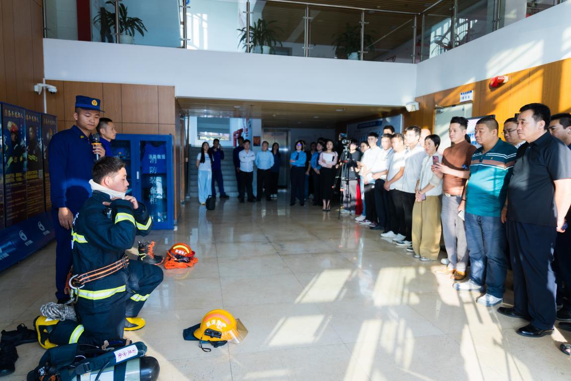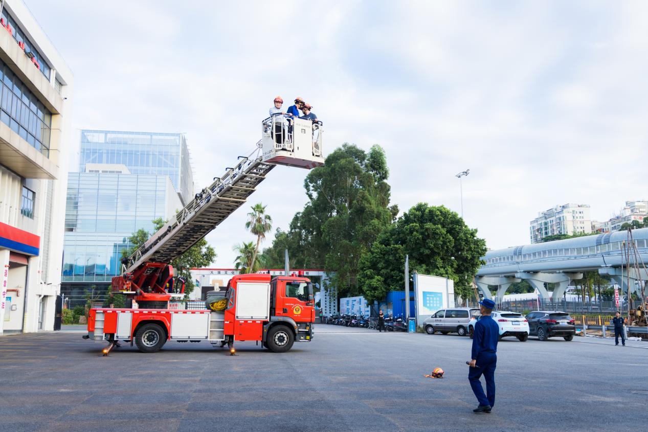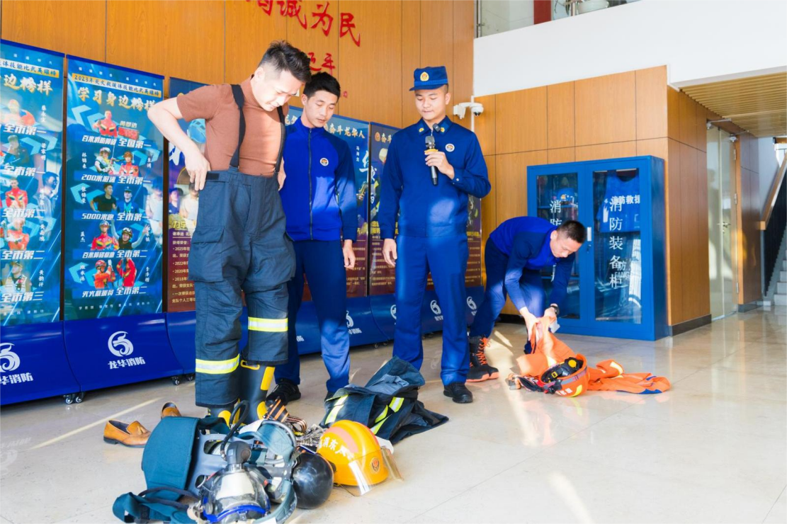 “光说不练假把式”,本次培训还设置了实战演练环节。在消防员的专业指导下,学员们踊跃参与,与消防员们积极交流互动。大家依次体验了穿戴消防灭火战斗服、佩戴头戴式防烟面罩、灭火器精准扑救油桶火、快速连接室内消火栓水带以及挑战云梯车登高五大核心实训项目。