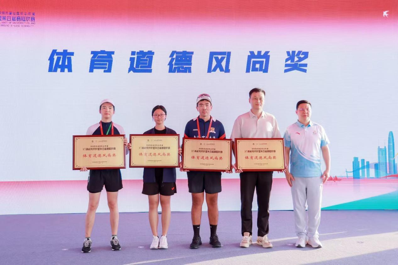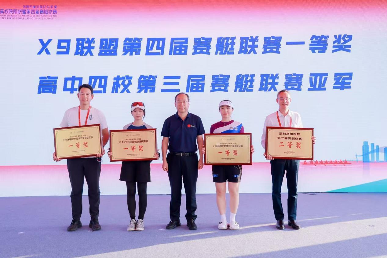 下午进行的300米竞速决赛成为全场焦点,各队赛艇在大沙河水面轻盈穿梭,于夕阳底下水波粼粼金色光景中,划出一道道流畅而优美的弧线,引得现场观众掌声雷动,气氛热烈非凡。经过多轮较量,各组别的冠军队伍脱颖而出。最终,根据三站总积分排名,北京大学深圳研究生院以总积分第一荣获X9高校院所联盟第四届赛艇联赛团体总冠军。清华大学深圳国际研究生院、哈尔滨工业大学(深圳)、深圳理工大学-中国科学院先进技术研究院获得一等奖,南方科技大学、深圳大学、香港中文大学(深圳)、鹏城实验室获得二等奖。深圳外国语学校、深圳高级中学、深圳中学分别获得高中四校第三届赛艇联赛冠亚季军。