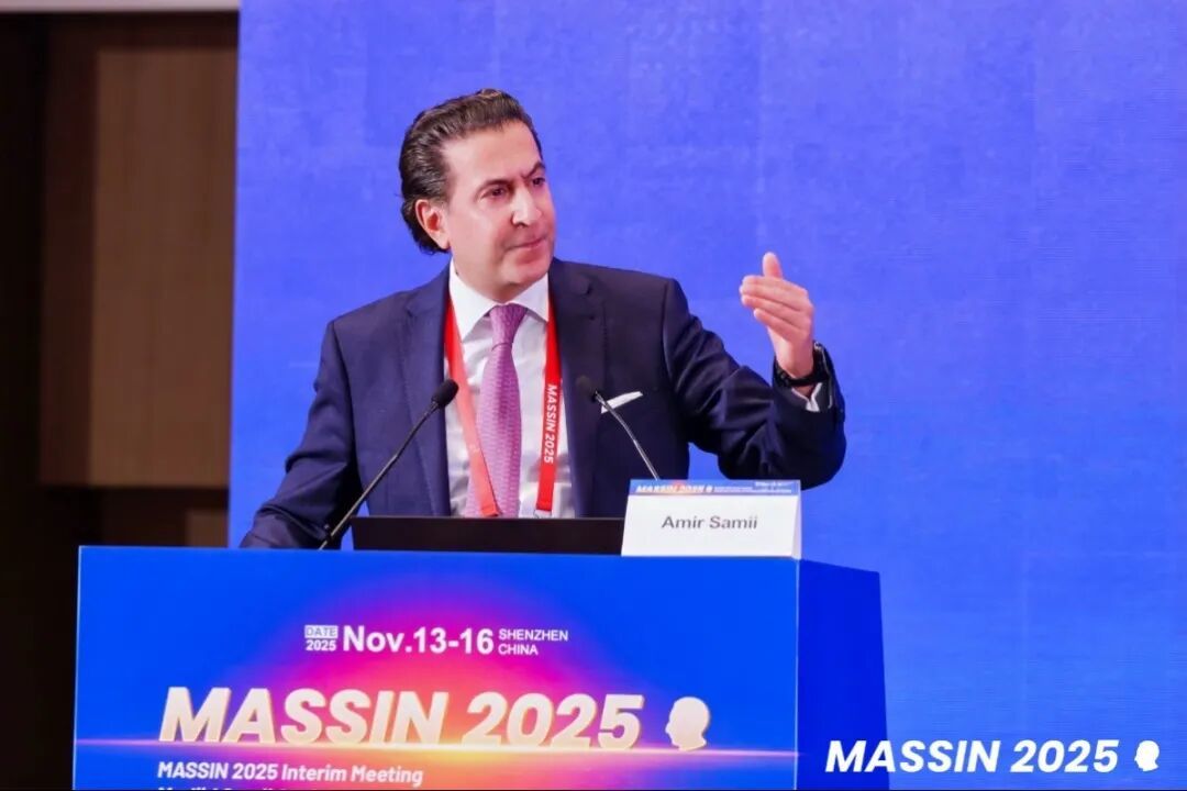 大会主席、德国汉诺威国际神经科学研究所副所长阿米尔·萨米教授致开幕辞。他首先代表MASSIN向与会者表示热烈欢迎。他深情回顾了其父亲马吉德·萨米“教育、传承、卓越”的核心理念。他强调,MASSIN不仅是一个学术平台,更是一个全球神经外科大家庭,而深圳这座充满活力的城市,是探讨神经外科未来发展的绝佳地点。