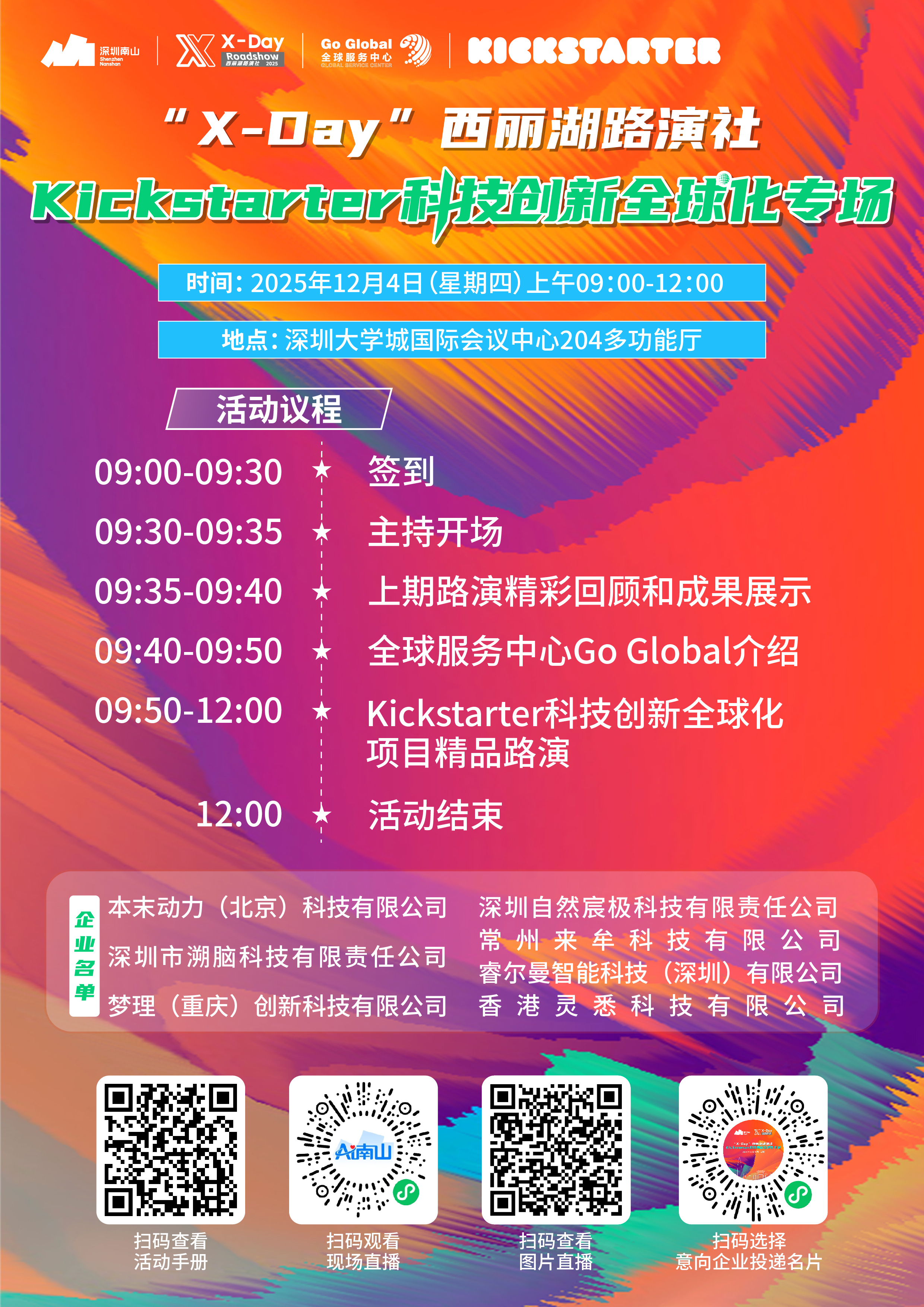 本次Kickstarter科技创新全球化专场的圆满举办,是“X-Day”西丽湖路演社聚焦产业热点、链接全球资源的成功实践,也是南山区持续优化科技创新生态、推动创新要素跨境流动的生动体现。