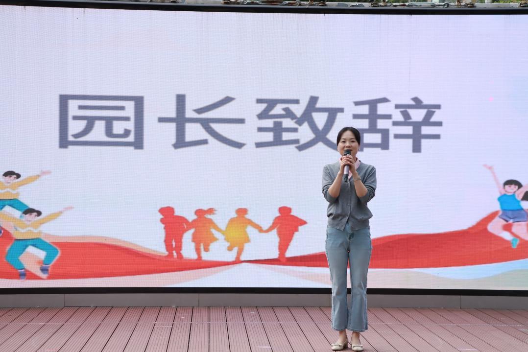 开幕式在庄严的升旗仪式中拉开序幕。随后,大班孩子带来活力四射的《运动啦啦操》,展现出她们饱满的运动热情与蓬勃朝气。园长阳敏在致辞中强调,运动是幼儿探索世界、发展身心的重要途径,不仅能强健体魄,更能培养坚韧、协作与自信的品格。她表示:“我们希望通过本次运动月,打破课堂的边界,让运动成为一种习惯、一种生活方式。让孩子们在奔跑中感受自由,在协作中学会共情,在挑战中收获成长。”她还呼吁家长与教师携手,共同为孩子们营造一个支持、鼓励、充满乐趣的运动环境,让健康与快乐伴随每一个孩子的成长历程。