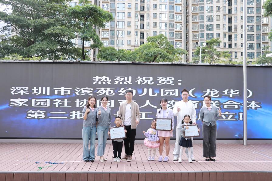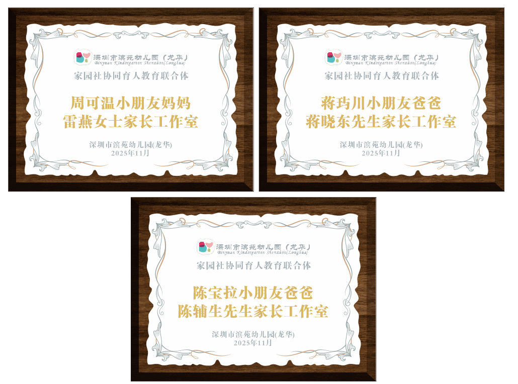 本次活动的重要环节之一是深圳市滨苑幼儿园(龙华)第二批“家长工作室”的正式启动。周可温小朋友妈妈雷燕女士、蒋玙川小朋友爸爸蒋晓东先生、陈宝拉小朋友爸爸陈辅生先生等家长代表获颁证书,标志着家园共育进一步走向体系化和常态化。本次家长工作室的新成员们汇聚各自多元的专业优势和广泛的社会资源,将能为孩子们打开一扇扇通往真实世界的窗。这些宝贵的资源不仅能够转化为孩子们平日里接触不到的生动课程和特色活动,更能在课堂上与生活中,为他们提供前沿的视野、丰富的实践机会和个性化的成长引导。