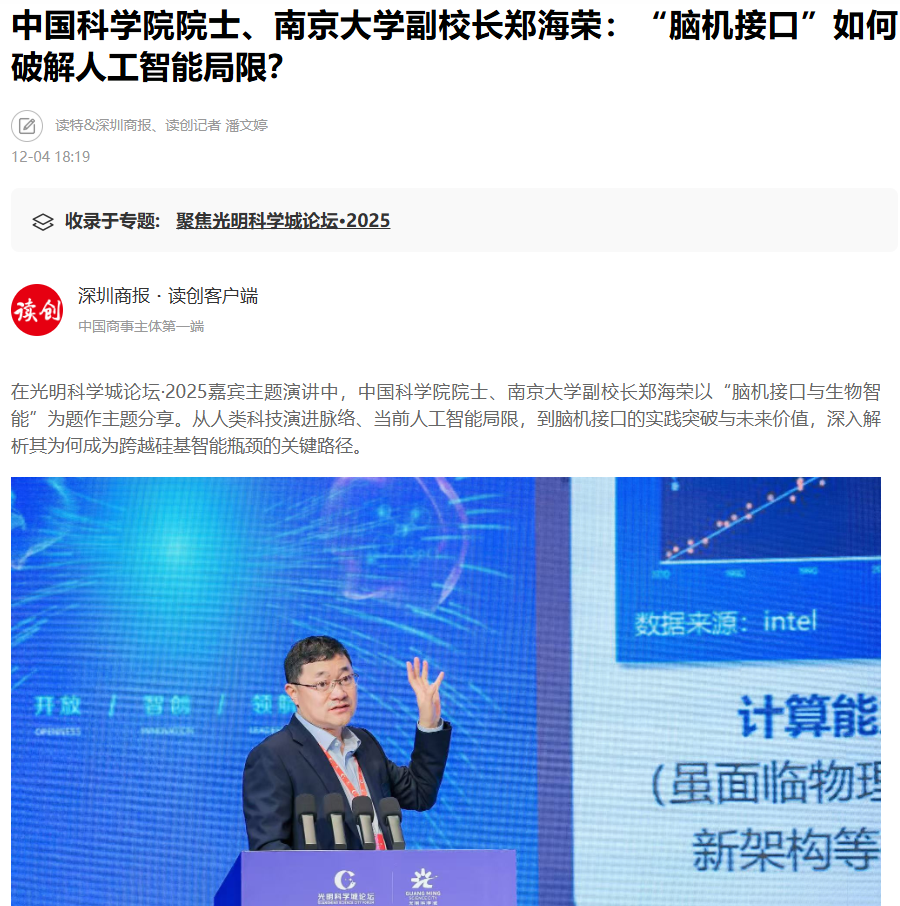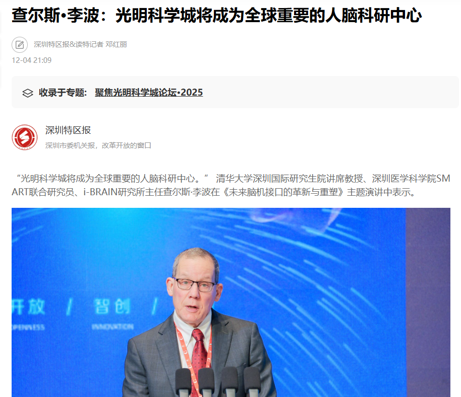 本届论坛是高端创新资源加速汇聚光明的一个生动缩影。论坛期间,清华大学教授查尔斯·李波表示“光明科学城将成为全球重要的人脑科研中心”,中国科学院院士郑海荣深入剖析脑机接口与生物智能的融合前景,深圳医学科学院研究员丹扬则对睡眠调控机制进行了前沿解读——这些顶尖科学家的深度参与,鲜明地凸显出光明区对全球智力资源的强大吸引力。