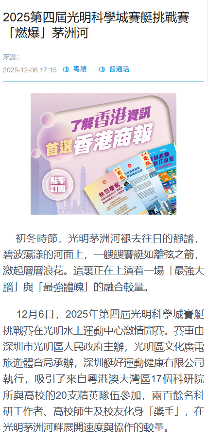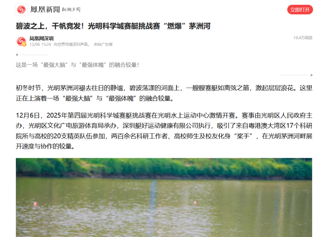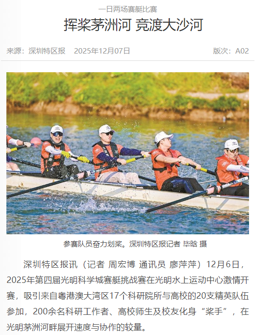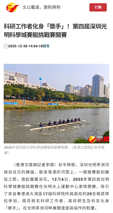 本届论坛期间,一系列高品质文体活动的举办,使户外运动热潮与科学城的创新脉搏同频共振。作为亮点活动之一,第四届光明科学城赛艇挑战赛吸引了粤港澳大湾区17个科研院所与高校的20支精英队伍参与。这项已连续举办四届的赛事,不仅是光明区一张极具辨识度的体育名片,也凸显了赛艇运动所强调的团队协作与科研精神的高度契合,生动展现出光明区打造“湾区户外运动之区”的独特魅力。