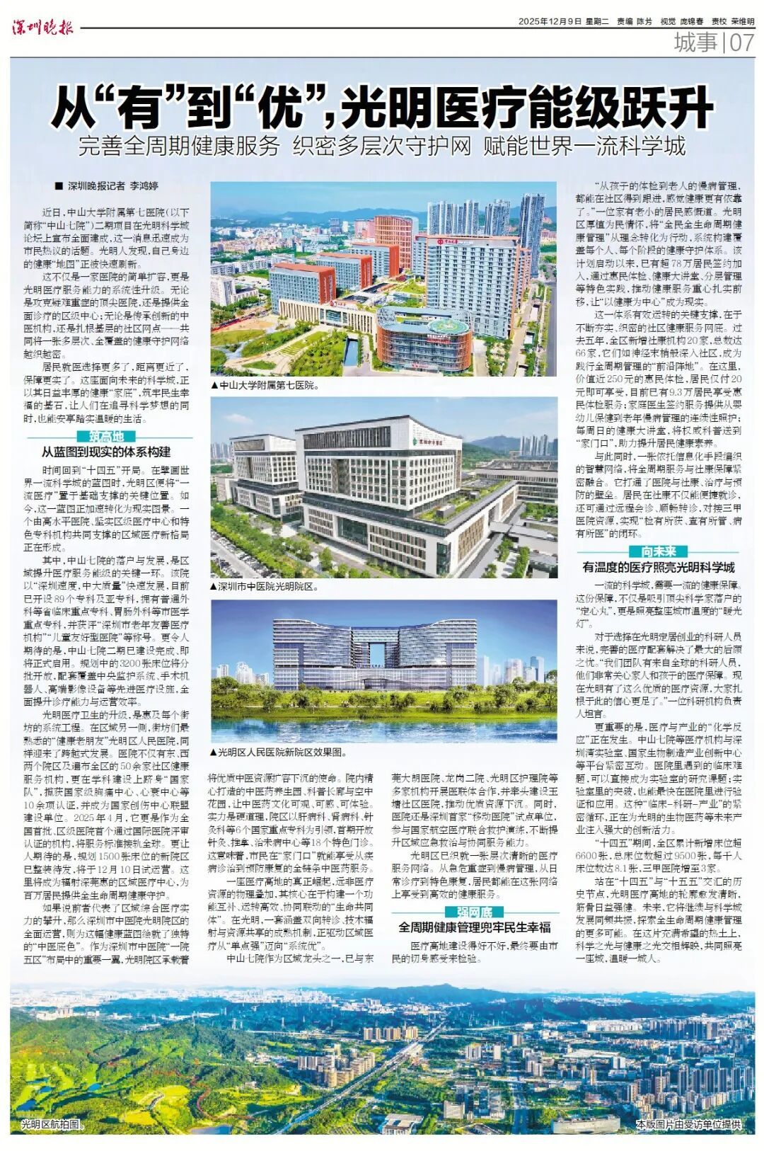 “十四五”期间,光明区医疗资源实现跨越式提升:累计新增床位超6600张,总床位数突破9500张,每千人口床位数达8.1张,三甲医院增至3家,居民就医选择更丰富、路径更便捷、保障更坚实。就在12月10日,光明区人民医院总院区正式启动试运营,为光明区再添优质医疗资源。随着这些高水平医疗机构的陆续投用,光明科学城不仅以日益厚实的“健康家底”筑牢民生幸福根基,更让在此追梦的科研人才与广大居民,能同时享受触手可及的优质健康服务。