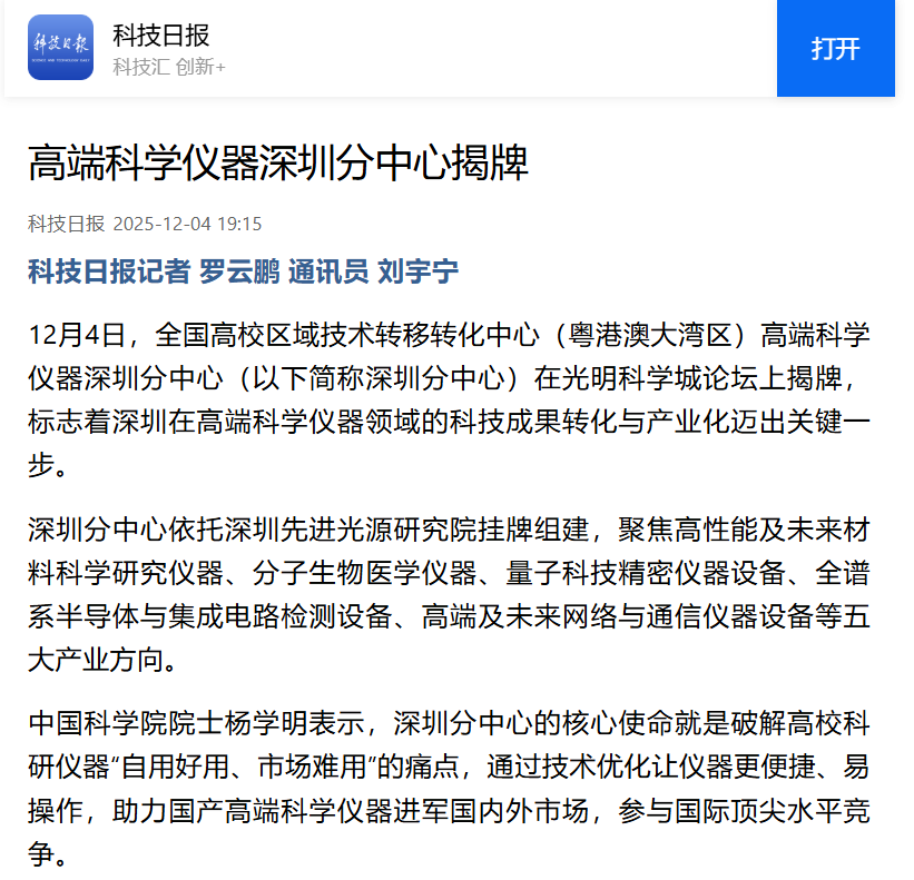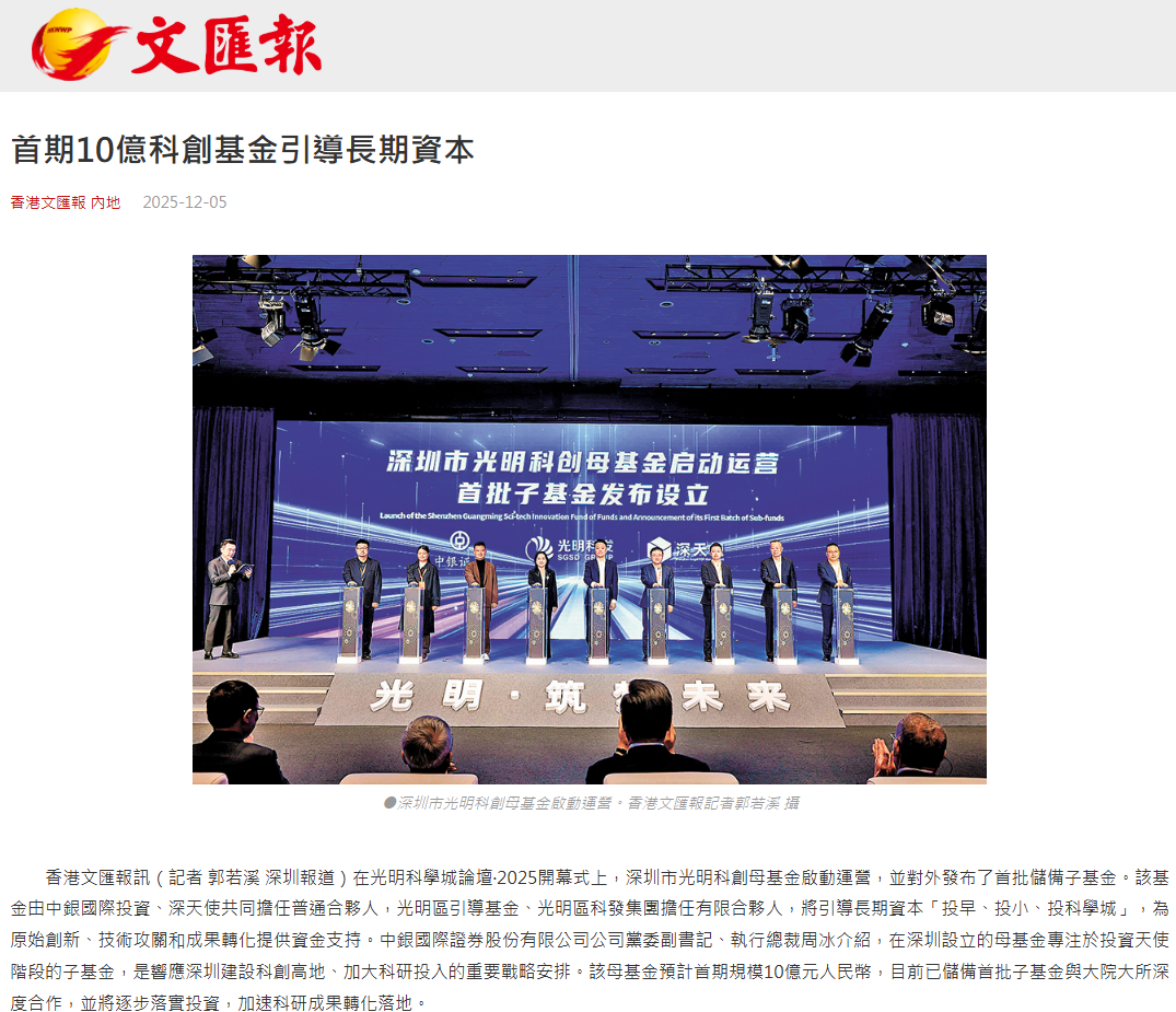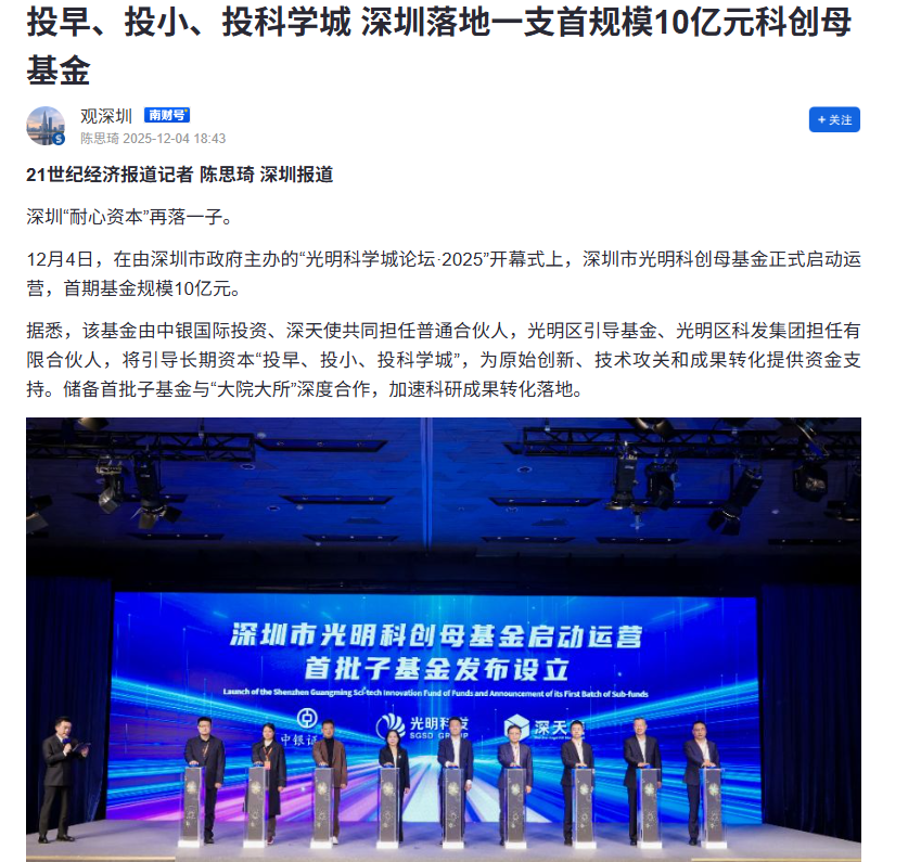 论坛上同步揭牌的高端科学仪器深圳分中心,旨在系统破解高校科研仪器“自用好用、市场难用”的痛点,推动国产高端科学仪器从技术参与国际前沿角逐。规模达10亿元的深圳市光明科创母基金启动,彰显“耐心资本”属性,明确“投早、投小、投科学城”原则,引导长期资本注入科技成果转化关键阶段。二者共同强化了光明科学城在产学研融合与金融支撑方面的系统能力,为提升科技成果转化效能注入了双重动能。