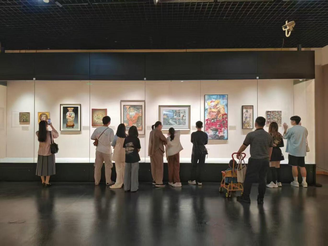 黄伟雄、吴锦华的粤绣(珠绣)插屏《出淤泥而不染》以珠绣技艺绣制莲花画作;裴永中的陶瓷画《丹霞奇观》通过釉色窑变呈现丹霞地貌景观;曹加勇的砚雕《兰亭雅集砚》巧用俏色雕刻兰亭雅集、流觞曲水场景,充满生机意趣;梁冰的陶艺《四水归堂》将先人创造的文字符号、象形文字等融入特制陶砖……除了可欣赏精美展品,11月2日下午推出“民间文艺家现场展示”,组织鱼贴画、岭南棕编、剪纸(剪影)、缠花、景泰蓝5个民间工艺项目展示,吸引数千名观众到场观看;11月4日至21日,每个开馆日的下午都有一名参展艺术家在现场展示拿手绝活,让市民近距离感受精湛的民间技艺;深圳博物馆、深圳市民协联合vivo深圳共同发起“2025(首届)V光深影文化遗产摄影大赛”,号召市民朋友们以手机镜头聚焦城市文化现象,讲述城市文化故事。展览及系列配套活动成功让非遗技艺碰撞现代美学,让匠人精神融入城市发展,书写了“非”同“遗”般的时代故事和文化温度。