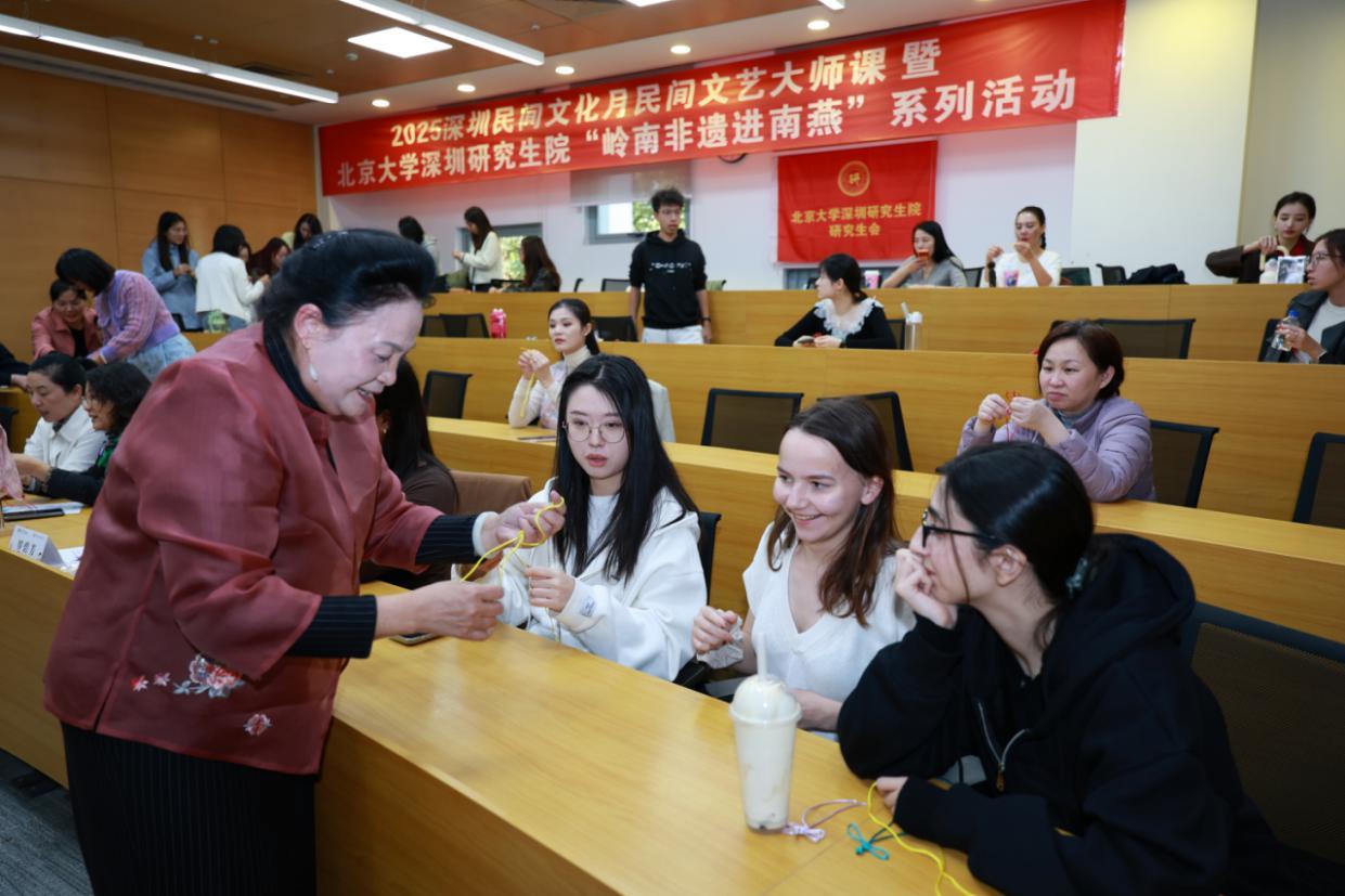 感悟一针一线里的艺术。11月21日,深圳市级非遗杨氏旗袍制作技艺代表性传承人、高级工艺美术师唐光艳在北京大学深圳研究生院分享《旗袍之美》,详细讲述旗袍的百年演变史,解析海派、苏派、广式旗袍的地域特色与文化符号;让同学们进行绫、罗、绸、缎、锦旗袍的鉴赏及试穿;指导大家动手制作盘扣,在一缠一绕之间完成一场与岭南美学对话的温柔实践,探讨旗袍剪裁中蕴含的东方身体美学与礼仪哲学,以及旗袍元素在可持续时尚、跨文化服装设计中的转化路径。