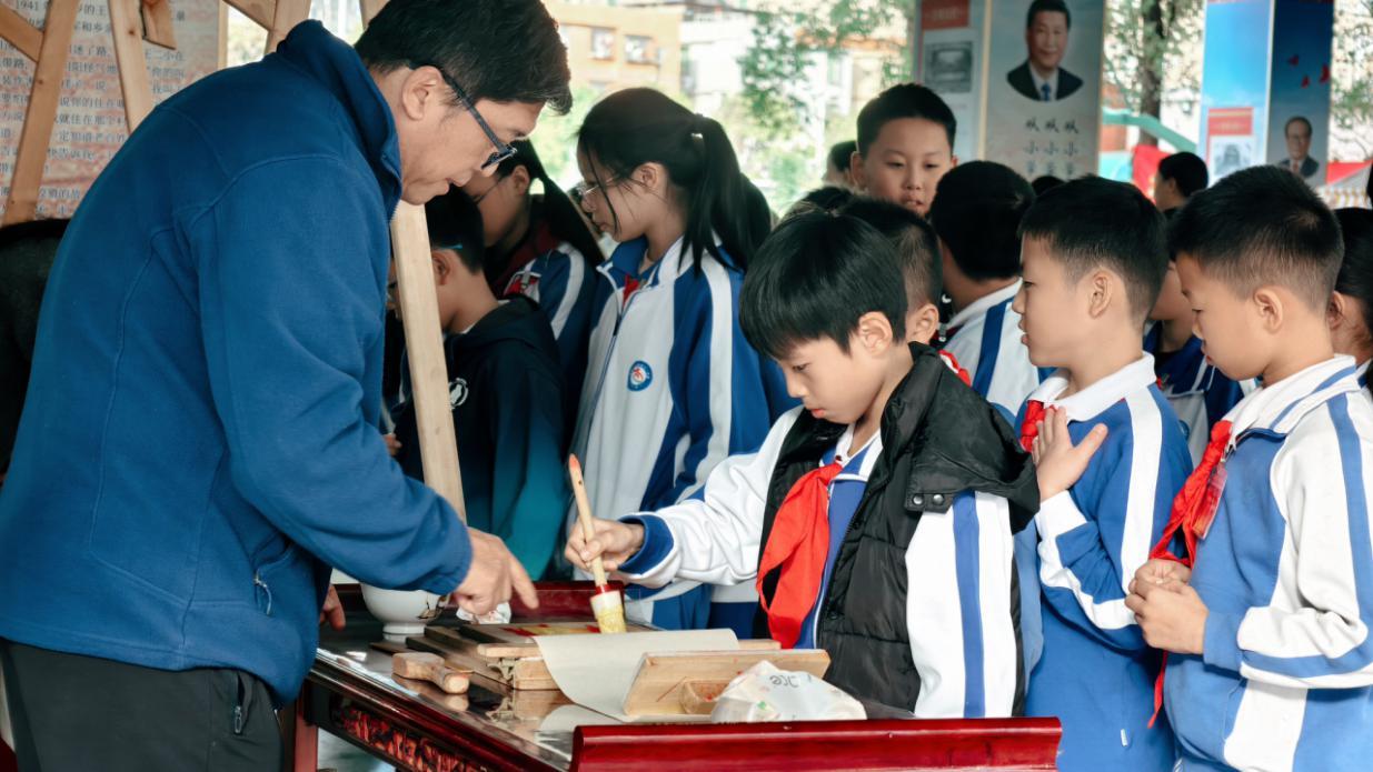 木偶戏生动有趣,瞬间切换的服饰引发孩子们阵阵惊呼;川剧变脸绝技惊艳全场,孩子们目不转睛想要探求神秘技艺背后的玄机;马头琴奏响《神马》,雄浑悠扬的旋律穿越时空;洞箫与古筝雅韵和鸣,清冷婉转的曲调尽显传统民乐的空灵意境,现场掌声与欢呼声此起彼伏。在手工实践区域,孩子们在工夫茶台前提壶注水,感悟东方礼仪;剪纸剪影摊位上红纸流转指尖,每一幅作品都凝聚着童真与匠心;在雕版套印的油墨香中,学生们亲手完成从刻板、上墨到印刷的全过程;岭南棕编传承人现场展示“一秒编蚱蜢”绝技,孩子们跟着学习编出栩栩如生的小蚂蚱、玫瑰花;在疍家鱼贴年画体验区,孩子们学习创作鱼贴画,将民俗意趣与现代审美完美融合……传统文化穿越时空依然绽放魅力,孩子们频频惊呼、称奇,纷纷表示“想再参加”“要向家人介绍传统技艺”。