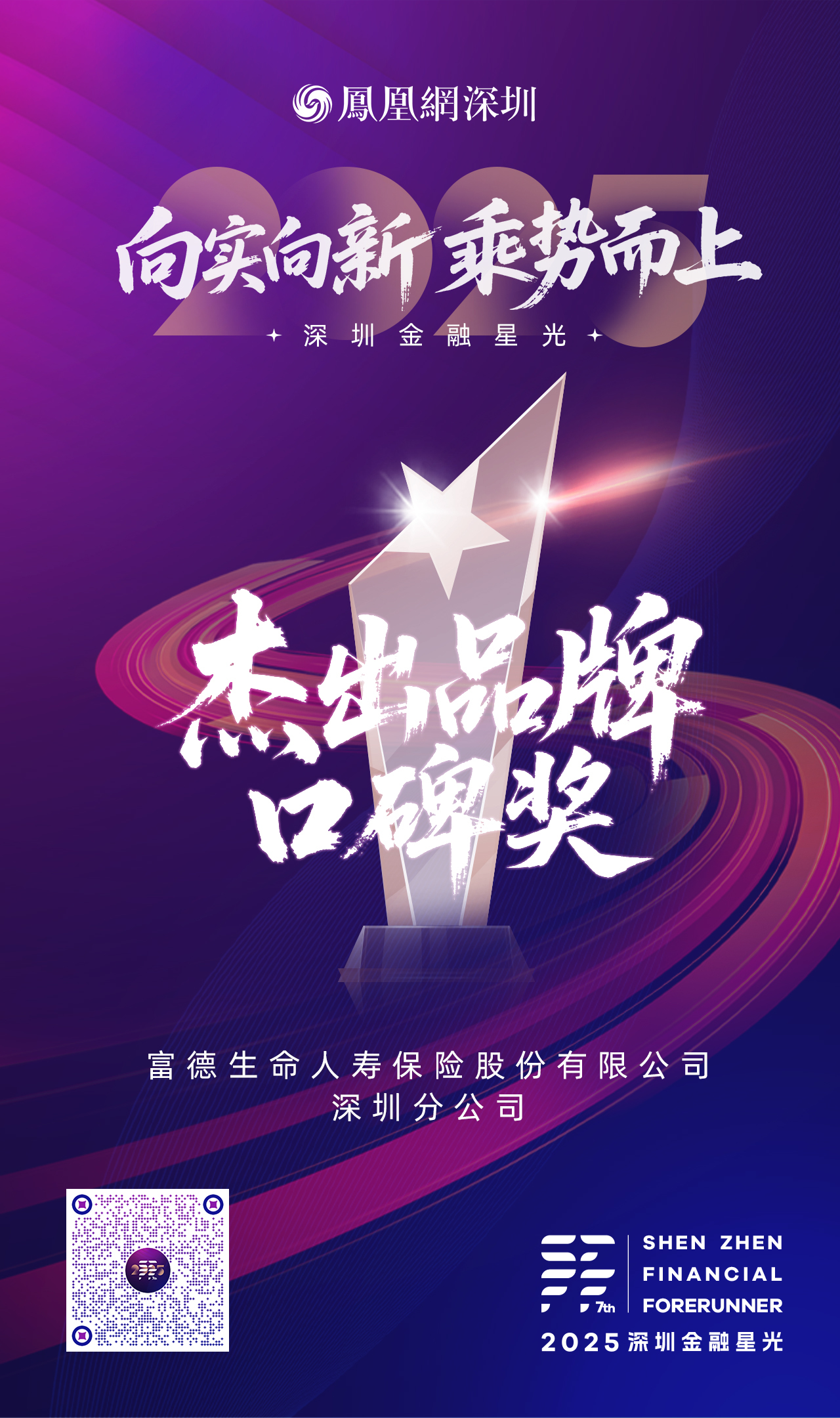 近日,由凤凰网深圳发起,携手深圳市银行业协会、深圳市保险业协会共同打造的第七届“2025深圳金融星光”活动正式拉开帷幕。富德生命人寿深圳分公司凭借其深厚的公益积淀、专业的服务体系与持续践行的社会责任,荣膺“2025杰出品牌口碑奖”。这一荣誉是对该公司长期坚持以客户为中心、以诚信铸品牌、以公益暖民心,从而赢得社会广泛认可与良好声誉的高度肯定。