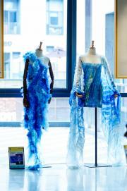 孙贵填《华韵新尚》系列将传统盘扣、刺绣与旗袍样式融合现代剪裁,彰显东方美学与潮流碰撞;高捡平《古韵新裁》系列提取传统元素改良旗袍款式,兼顾文化底蕴与当代审美。非遗应用上,周颖钰《烬界》系列以“锦灰堆”为灵感,结合贴金、火烧面料再造等手法打造防寒服;李嘉文《栗染山魂》采用“栗壳染”传统工艺,融合傈僳族服饰特色与侘寂美学;谢松夏子《染述》将扎染与编织结合,汲取唐代服饰元素展现独特风格。东方美学意象转化方面,王丹丹《一墨见山晓》融入水墨气韵,王文《墨影叠峦》以激光切割皮革再现山水意境,周婷《栖风·云蝶》萃取唐代蝴蝶纹样,诠释唐韵雍容与灵动。