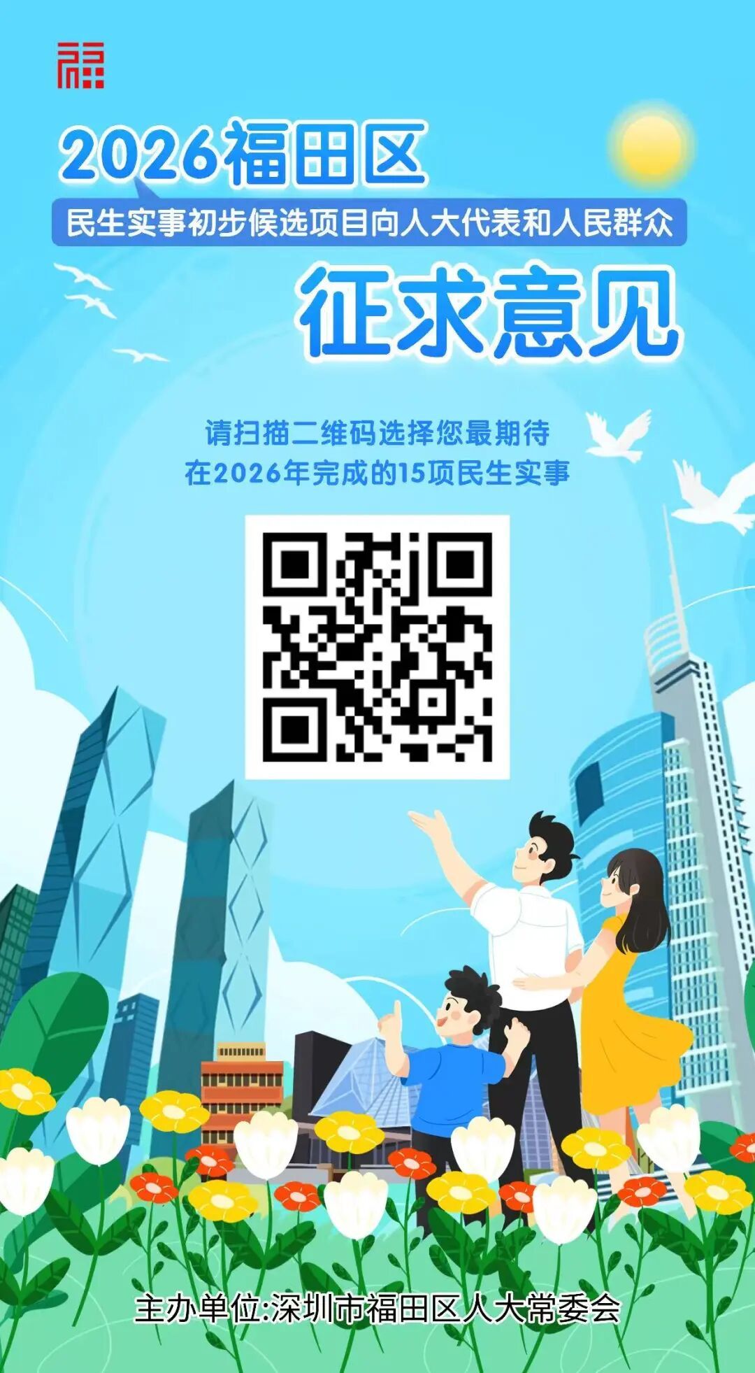 为充分听取人大代表和人民群众意见建议,推动2026年福田区民生实事候选项目真正吸纳民意、汇集民智。福田区人大常委会制作了民生实事初步候选项目意见征求宣传海报,现征求广大市民朋友的意见。