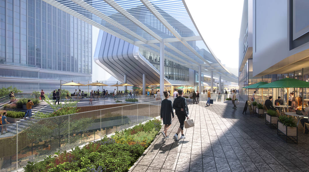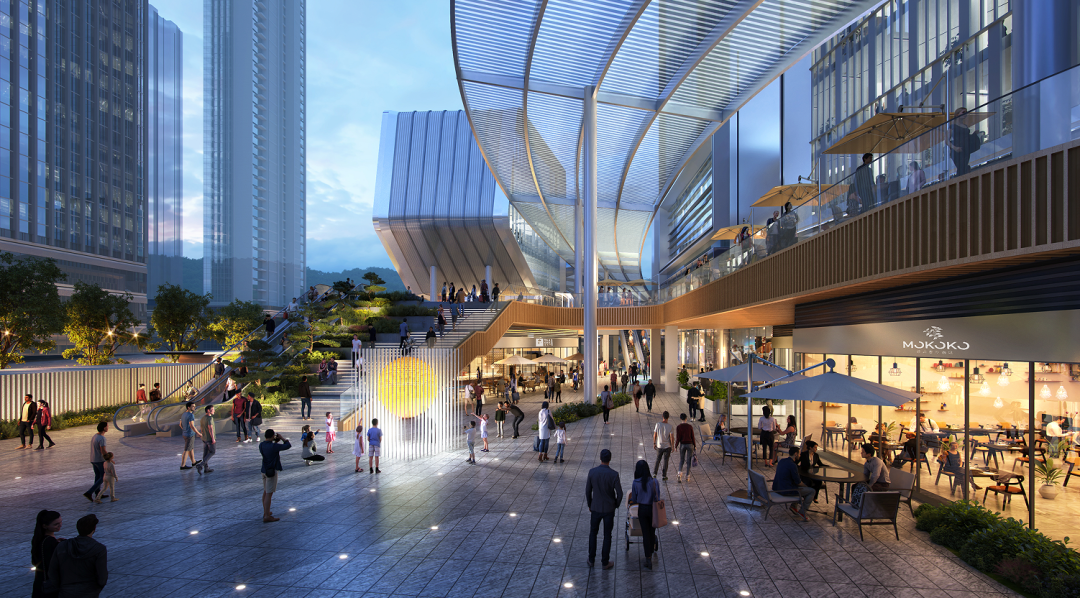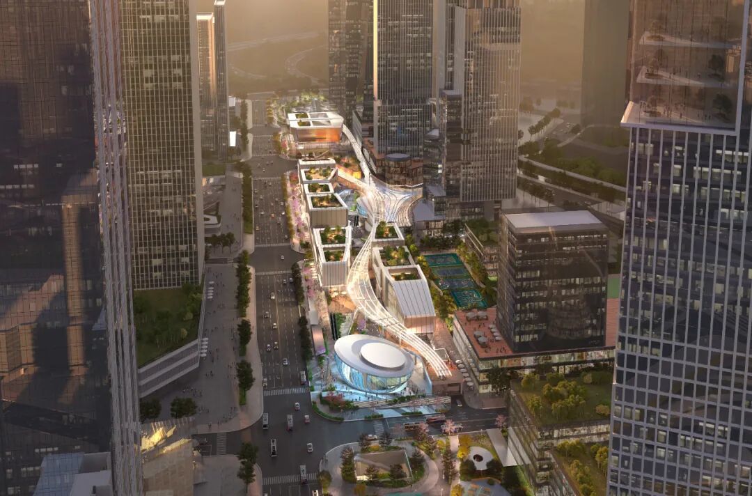 值得一提的是,从东至西五个地块的上盖开发将通过二层连廊系统连为整体,搭建起融合共享会议、金融服务、商业餐饮等功能的产业服务平台,实现人车分流的同时,促进不同功能区间的互动,打造人气魅力场所和城市活力中心。
