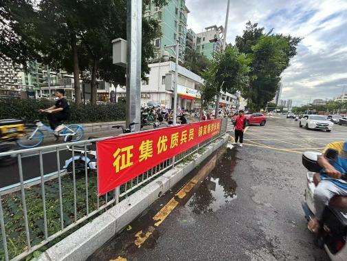 户外,社区以在小组悬挂横幅、社区电子屏滚动播放宣传标语的形式,营造应征氛围,提高征兵的知晓率。