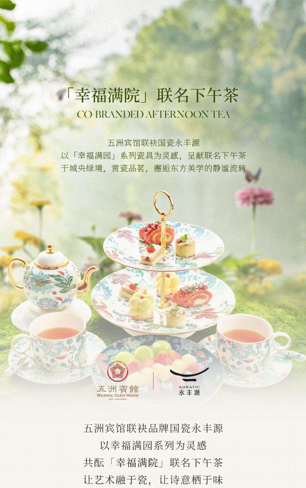 近日,深圳五洲宾馆联袂国瓷永丰源,以「幸福满院」系列瓷器为灵感,推出联名主题下午茶。此次跨界合作将国宾级服务的精致底蕴、国宴瓷的匠心美学与「幸福满院」的温情寓意深度融合,为都市精英打造一场兼具味觉盛宴与文化浸润的沉浸式体验,奏响传统与现代交融的生活美学新章。