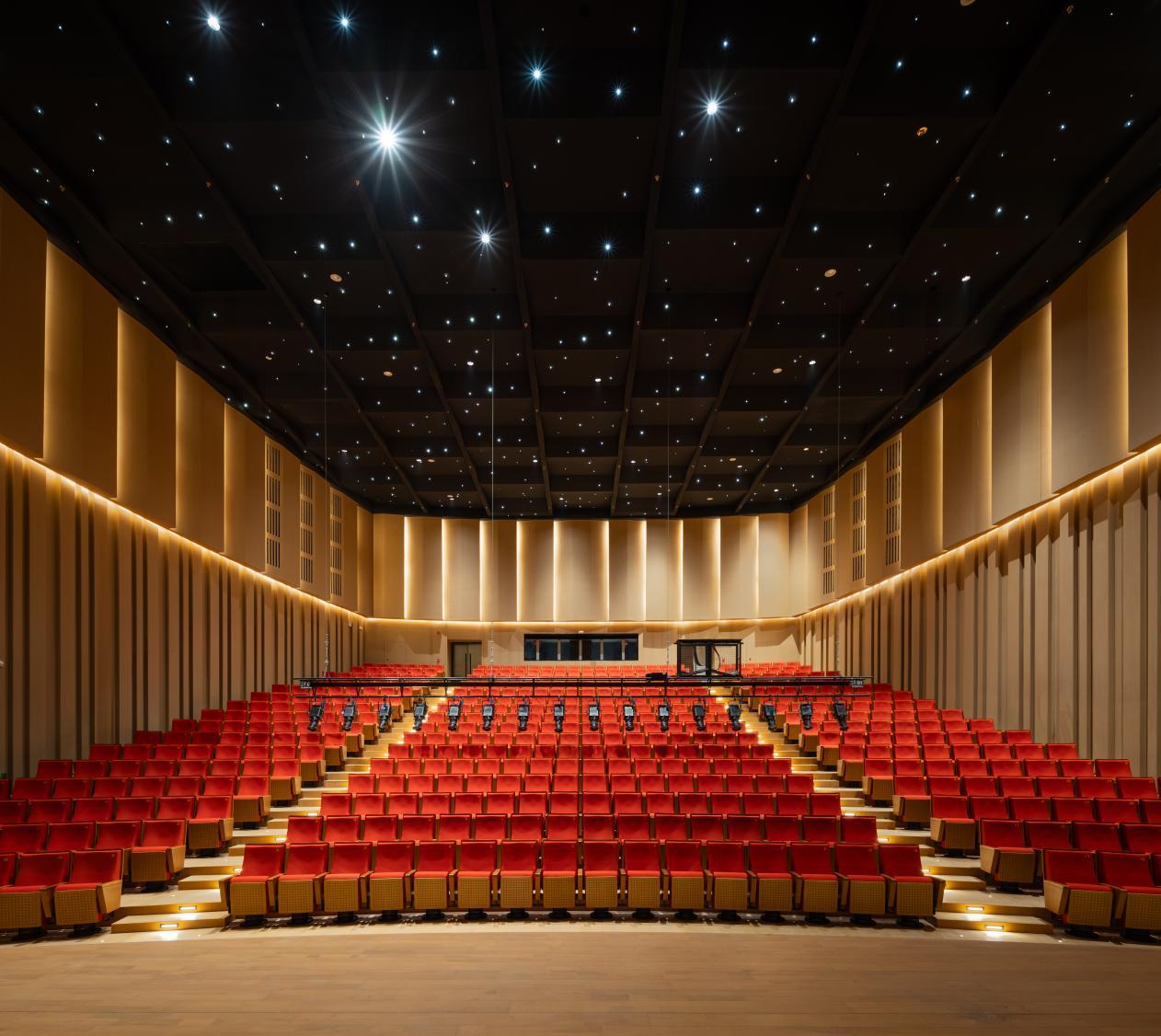 裙楼由聚橙剧院院线整体运营,拥有一个1000座国际标准大剧场、一个500座专业声学音乐厅、四个120座黑匣子剧场及艺术展厅,可承接音乐剧、舞剧、话剧、音乐会及跨界艺术等演出,此外,还配备排练厅、琴房等专业设施,设有屋顶花园、下沉广场等公共空间;秉承“开放共享、活力共生”的理念,将通过举办公益演出、主题展览、艺术普及、体育休闲及创意市集等常态化活动,让市民在一栋建筑内即可体验多层次、高品质的文化内容。中心不仅覆盖从经典到前沿、从大型到小型的多元演艺需求,更将构建起“创作—演出—展示”一体化的文化生态,塑造具有国际影响力的大湾区公共文化创新会客厅。