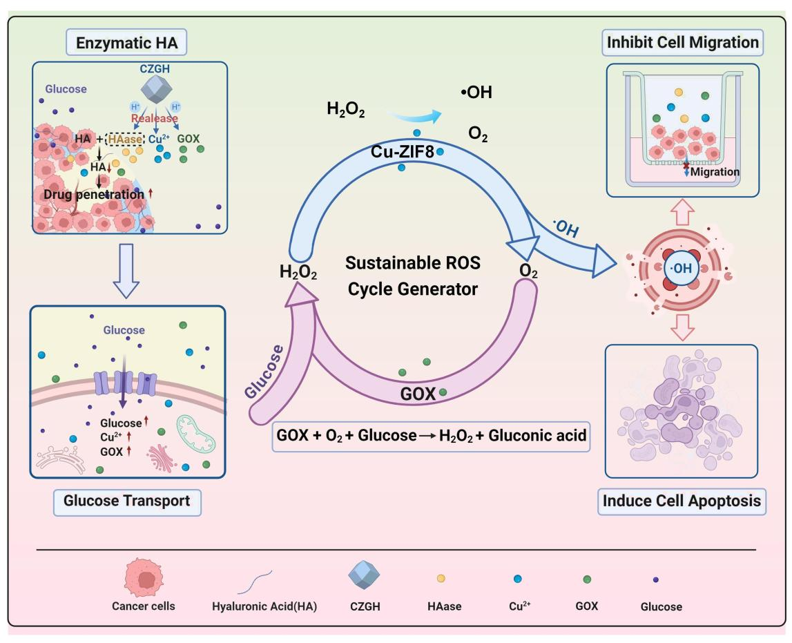 他们研究开发了一种可持续ROS循环发生器(SRCG),能够连续产生ROS以实现高效肿瘤CDT。 SRCG 采用多孔金属-有机框架材料(Cu-ZIF8)作为载体,同步递送葡萄糖氧化酶(GOX)和透明质酸酶(HAase)。该方法构建出高效纳米反应器Cu-ZIF8@GOX@HAase(CZGH),可在酸性条件下释放GOX 和HAase以水解葡萄糖和透明质酸。生成的产物可与CZ中的铜离子反应,产生高浓度 ROS,促进肿瘤细胞死亡。此外, CZGH 可降解细胞外基质(ECM)并增强肿瘤通透性,从而促进其递送并缓解缺氧。这使得葡萄糖能够渗透至肿瘤组织,确保血流中葡萄糖向 SRCG 系统的充足供应,进而实现可持续ROS生成。 SRCG 在CDT中的有效性已在体外和乳腺癌小鼠模型的体内研究中得到证实凸显了其作为突破性肿瘤治疗策略的潜力。