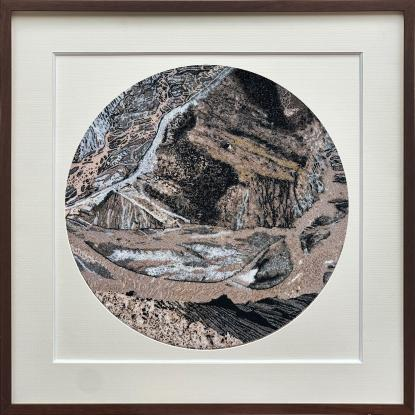 《峡谷奇光》系列作品试图捕捉的是大峡谷瞬息万变的光影与永恒的沉静之间的张力。峡谷深处的色彩如同被时光雕刻过一般,层叠、沉稳,却在光线掠过时迸发出意想不到的辉煌。珠绣的折射与微光,使画面既具岩壁的质感,又仿佛藏着自然能量的脉动。观者可在珠面中感受到峡谷的幽深、风化的痕迹,以及光从缝隙中照入时的那份神秘与蓬勃。