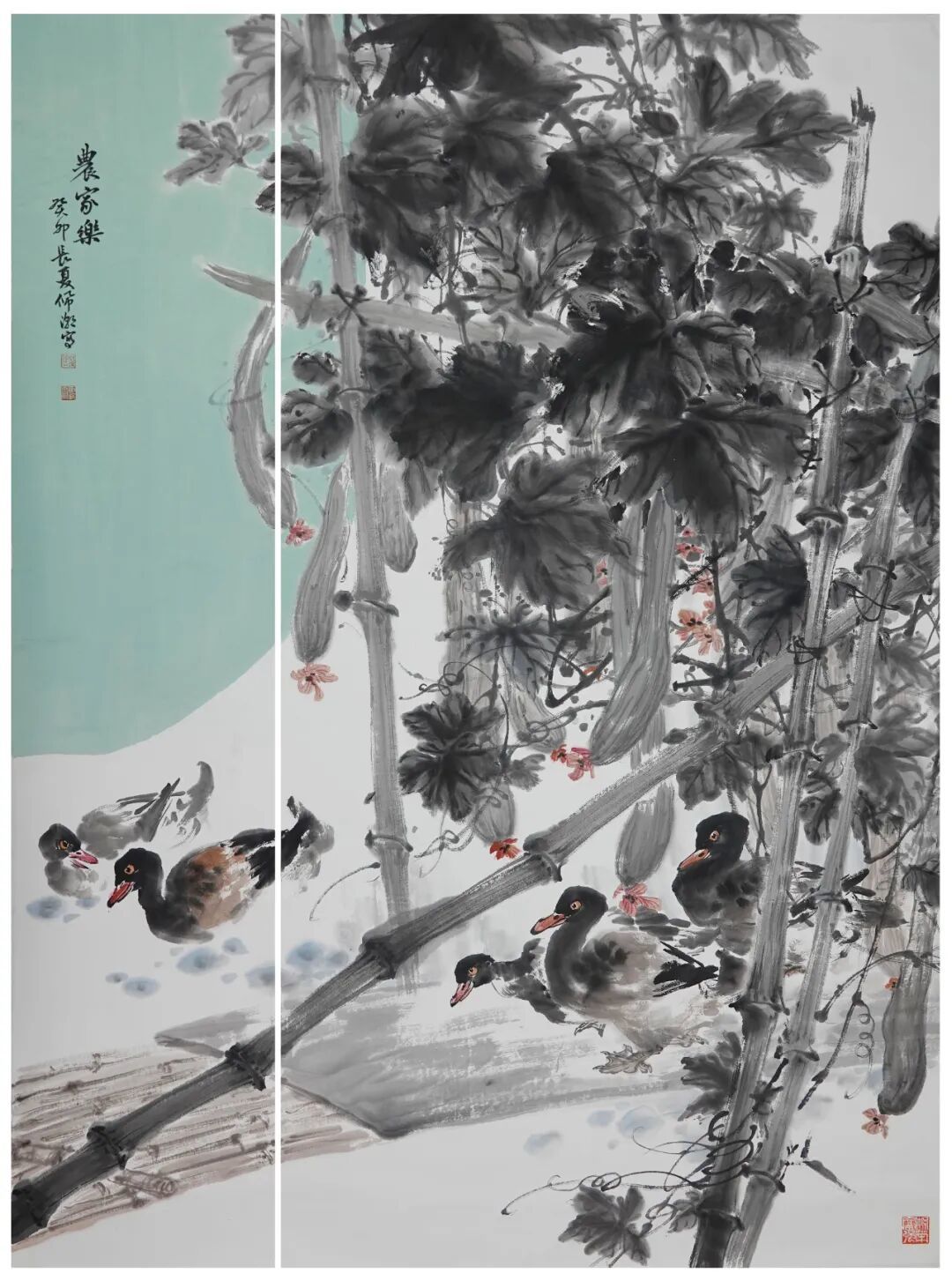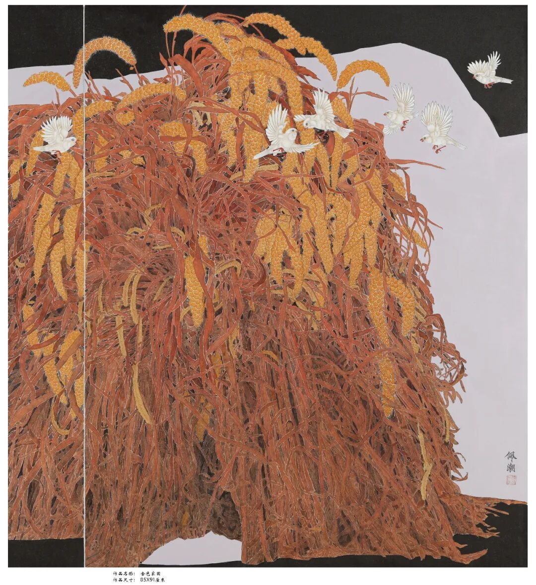 余之画,或取田园之趣,绘葵藿向阳之姿、稻菽翻浪之盛,寄情乡土,感念生民之乐;或写山川之雄,描峰峦叠嶂之态、溪泉潺湲之韵,体悟自然之浩,抒发胸中之丘壑;或撷市井之新,融古塔新风、白鸽繁花于卷,绘时代之盛,颂山河之安。