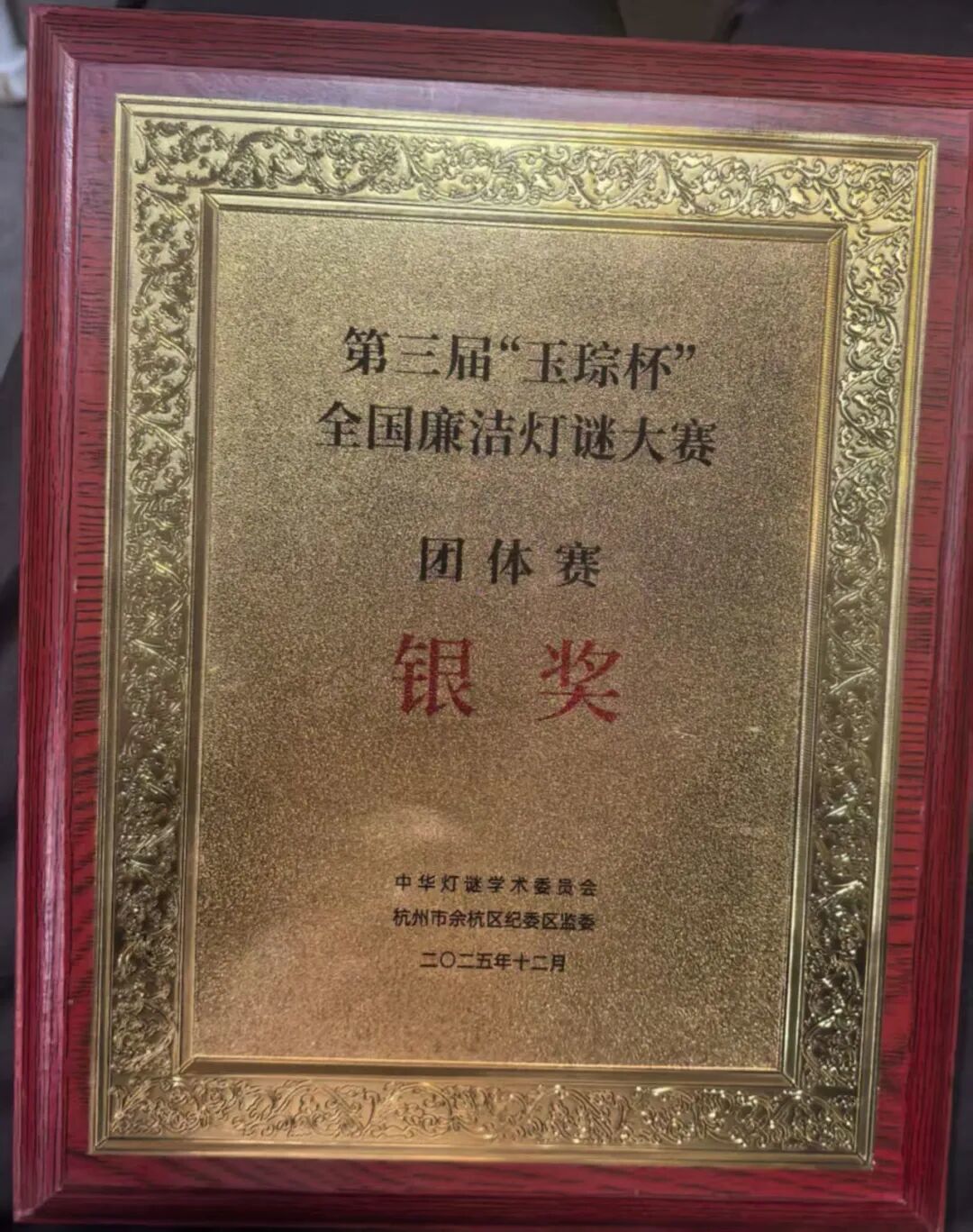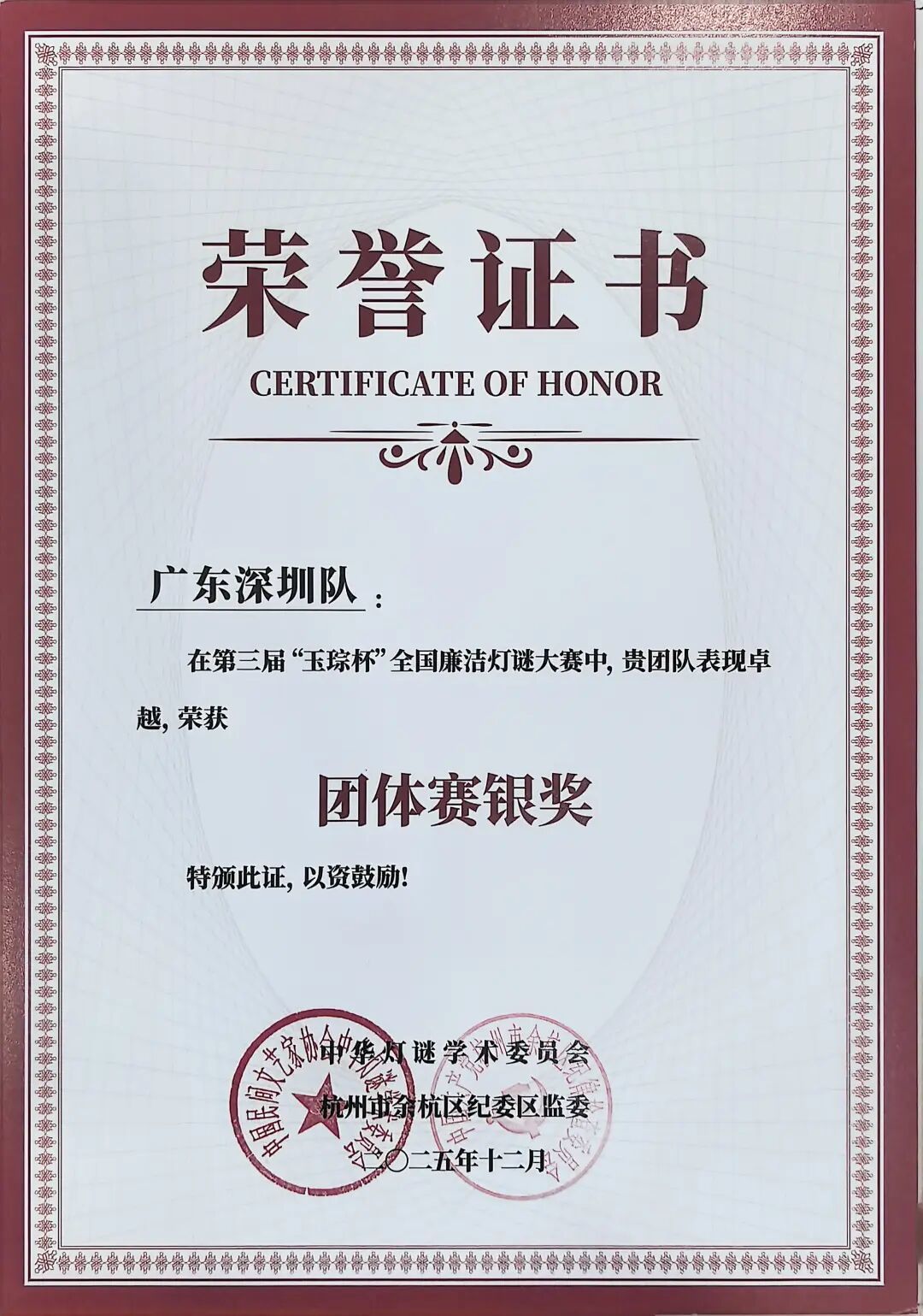 2025年12月19日-12月21日,第三届“玉琮杯”全国廉洁灯谜大赛在杭州余杭区黄湖镇成功举办,深圳市灯谜学会庄毓添、陈培楷、王楷波、陈煜参会,王斌强担任电控赛技术支持。在创作赛中,陈培楷获命题创作奖,陈煜获自荐佳谜奖;在个人赛中,王楷波获金奖,陈培楷、陈煜获铜奖;在团体赛中,由庄毓添、陈培楷、王楷波所组成的广东深圳队获银奖。