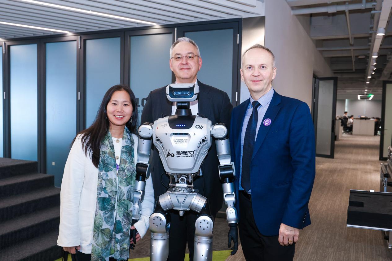 公司相关负责人为外宾展示了公司在机器人领域的最新成果。双足与四足机器人流畅上下楼梯、高扭矩关节精准对抗的演示,让外宾们直观感受到南山作为机器人产业高地的“硬核”实力。“他会跳舞!”“他的应用场景是什么?”“这让我看到了未来的生活。”访客们纷纷举起手机、轮流与机器人合影,记录下这些充满科技感的瞬间。