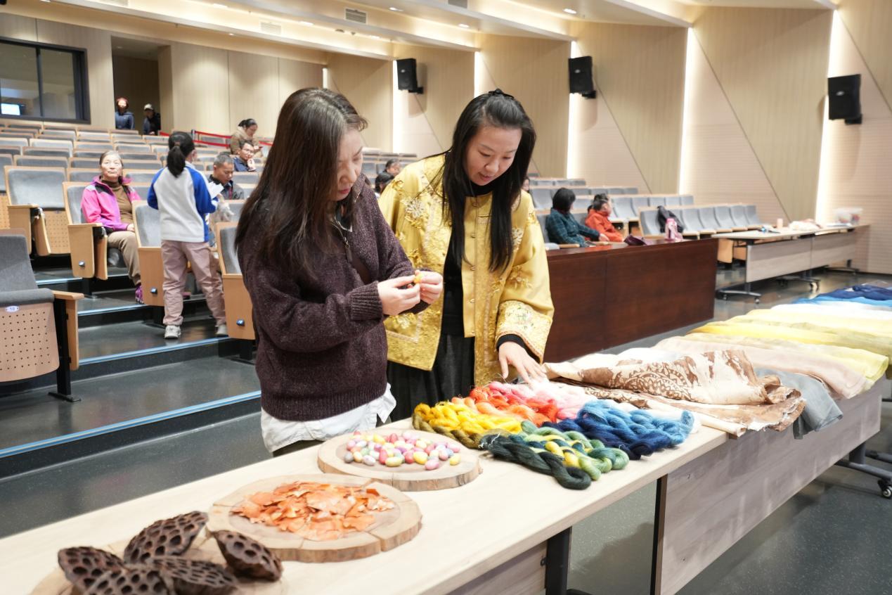 讲座开始前,展台上错落摆放的各色植物染围巾与天然染材,以其丰富的色彩吸引听众驻足观赏。