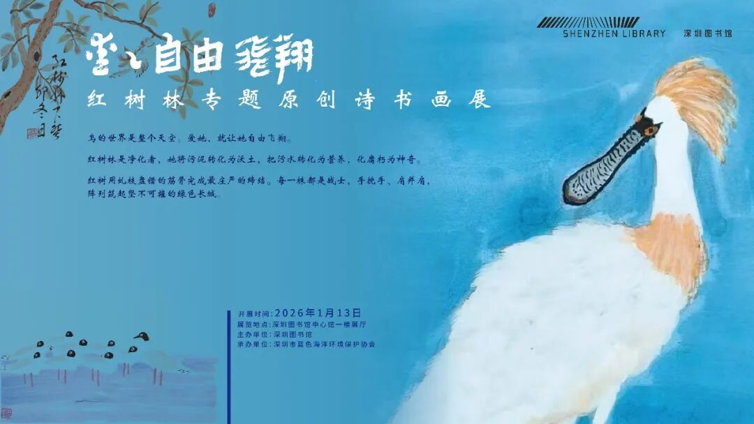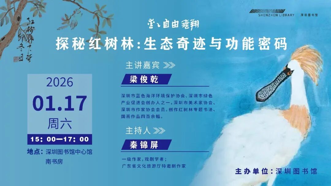 2026 年伊始,深圳图书馆邀您携手奔赴一场自然与艺术交融共生的“红树林之约”,活动囊括红树林主题讲座与原创诗书画展两大板块,以多元形式解锁这片“海上森林”的生态之美与人文之韵。