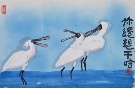 写意花鸟画:以红树林生态群落为创作核心,聚焦林中灵动飞鸟、潮间带自在生灵及各类红树植物,通过写意笔法勾勒万物情态——既有鸟类振翅、栖息的千姿百态,亦尽显红树林生物的丰富多样性,让自然生机跃然纸上。