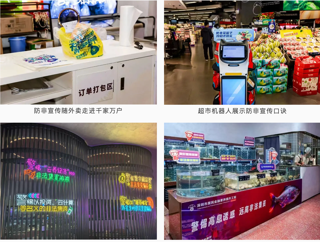 走进商超,在商品货柜旁悬挂防非反诈谐音标语;在购物小票印制防骗提示,成为顾客可以带回家的防非实用指南;超市机器人也“披”上金融知识贴纸,展示着防骗口诀;与外卖平台联合,将防非宣传资料和外卖袋打包随餐送达千家万户。