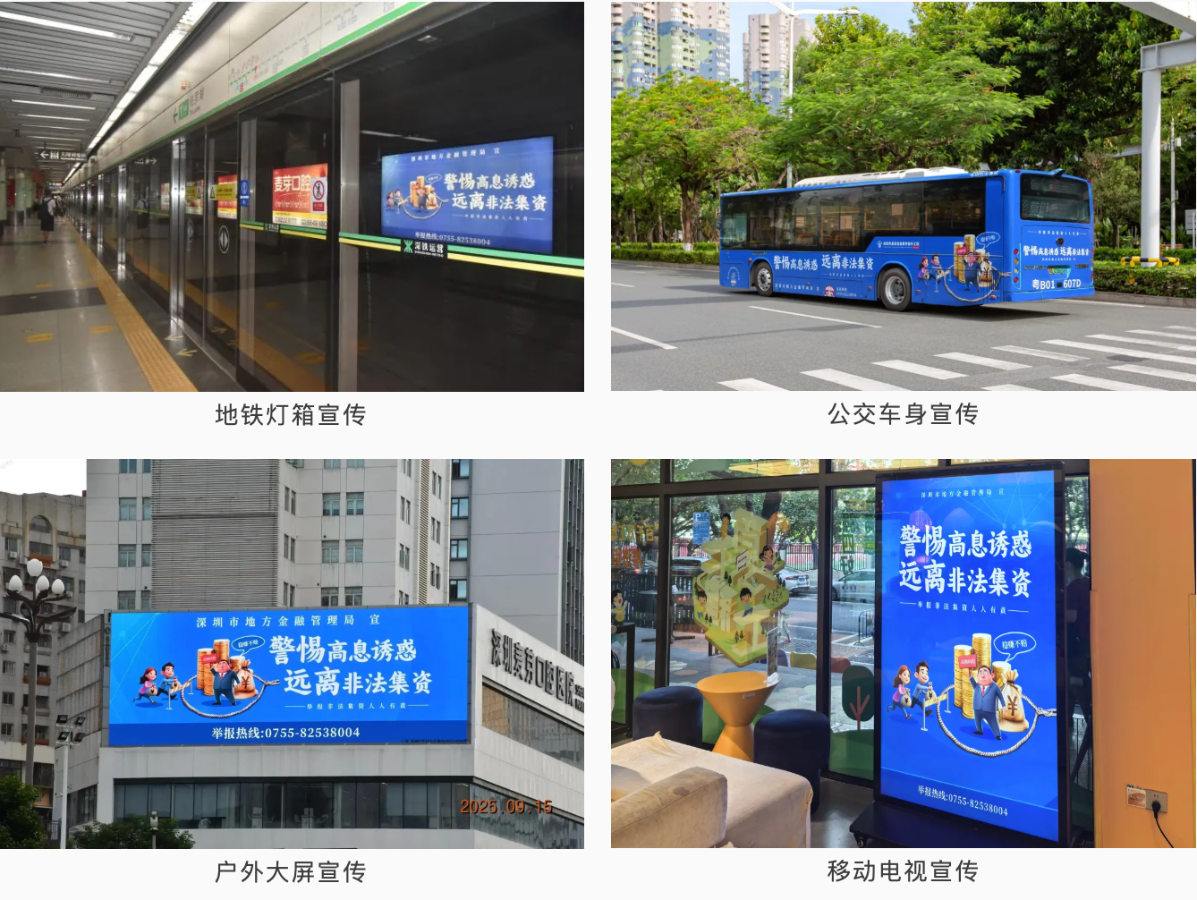 全年通过地铁灯箱与社区灯箱、公交车身、移动电视、城市大屏四维联动,形成“铺天盖地”的防非宣传声势,包括在近100个地铁站内灯箱、社区灯箱投放防非宣传海报,并对公交车车身进行涂装,在4条公交线路、30个地铁站点等人流密集领域开展防非宣传,覆盖罗湖、福田、南山、宝安、龙岗、龙华、盐田、坪山、光明等核心区域;更通过移动电视与户外大屏等10000多个视频终端,将防非知识延伸至楼宇、商圈等多类生活场景,让市民随时随地学习,轻松感受防非氛围,宣传累计覆盖超千万人次。