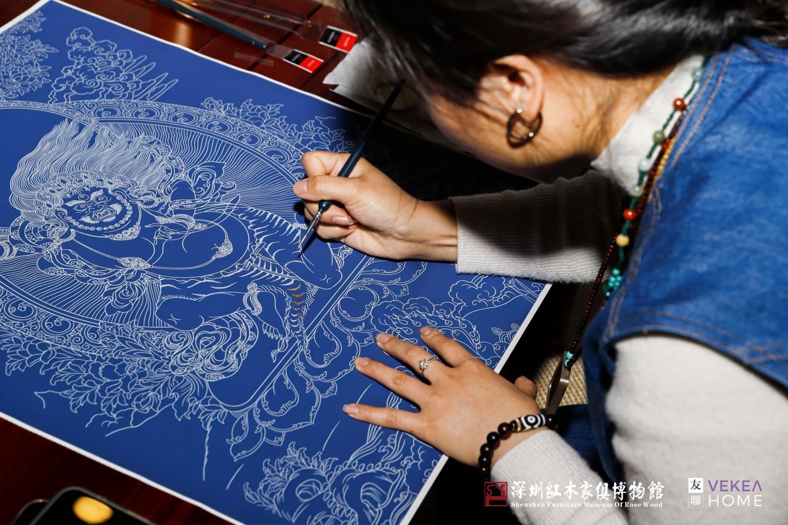 仪式后分会场的沉浸式体验同样热度不减。三大非遗互动体验活动同步开展。红木家具雅集艺术展以宋代“赏花、品茶、论画”三美为灵感,将红木古典家具与花艺、挂画、茶器巧妙搭配,打造出极具中式韵味的场景艺术,让观众仿佛穿越时空领略宋式生活雅集;唐卡艺术展则系统呈现了唐卡的发展历史、文化内涵及非遗技艺,参与者还可以在唐卡手绘区领取坛城线稿与颜料,在亲身创作中感受非遗技艺的魅力;非遗藏香体验区里,根德师傅现场演示藏香制作流程,详解药材功效与养生价值,个性化香囊定制服务深受青睐,不少市民还根据自身需求申请了助眠、静心、提神等专属配方。