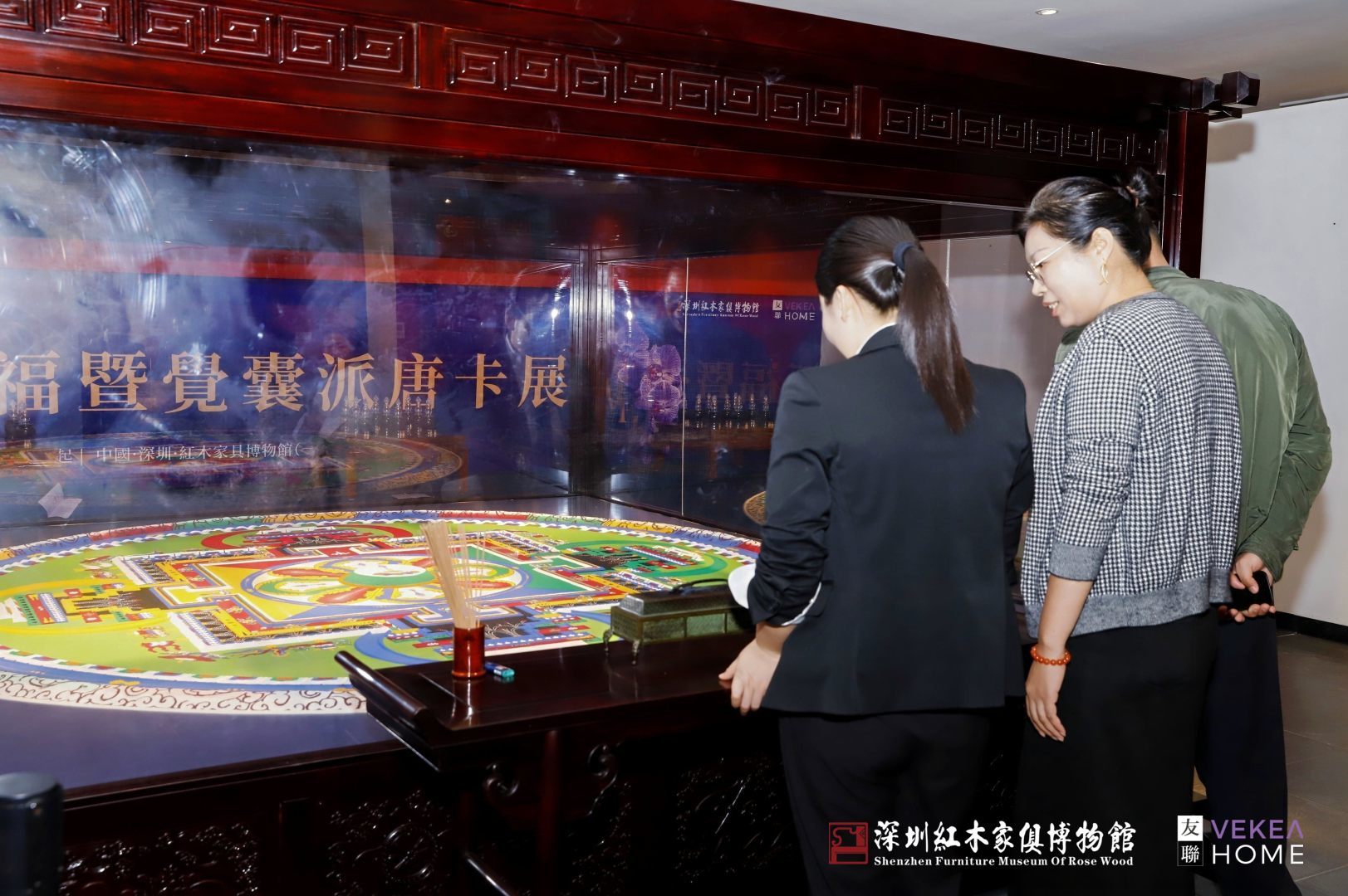 本次活动的核心亮点在于打破文化边界,将藏传非遗坛城沙画与红木家具文化深度融合,打造出兼具传统底蕴与创新活力的沉浸式体验。主会场一楼舞台区与坛城非遗展区内,沉浸式红木艺术展生动展现了红木与空间设计的完美契合,引得观众纷纷驻足欣赏、拍照记录,让参观者近距离感受传统工艺的匠心与温度,不少市民感叹“原来红木家具的制作有这么多讲究,每一道工序都藏着匠人精神”