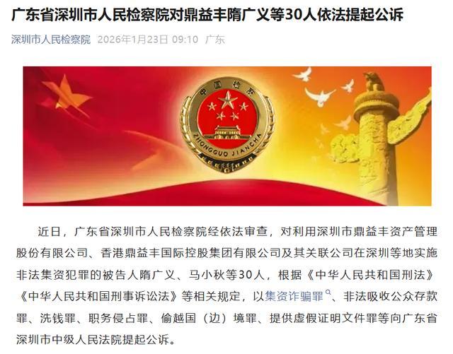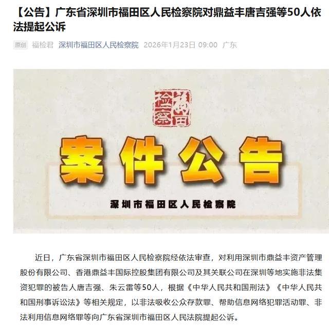 1月23日,广东省深圳市人民检察院发布公告,近日已依法对鼎益丰核心人员隋广义、马小秋等30人,以涉嫌集资诈骗罪、非法吸收公众存款罪等罪名提起公诉。同时,深圳市福田区人民检察院也对唐吉强等50名涉案人员依法提起公诉。