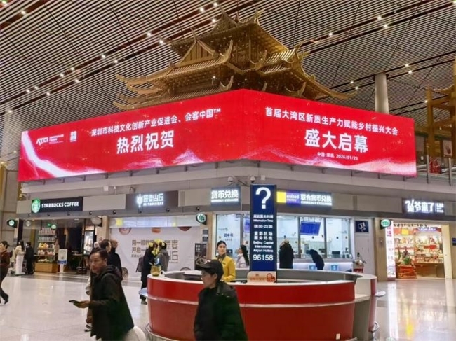 据悉,大会相关内容同日登陆北京首都机场T3航站楼大屏。该大屏与即将投入使用的湾区之星(深圳华强北)8K裸眼3D超高清巨屏矩阵,均为会客中国™云上会客厅核心展示窗口,是“中国首个新质生产力跨区域协同屏链”的重要组成部分,实现城际联动展示、双向赋能,有效扩大大会影响力,推动新质生产力赋能乡村振兴理念向全国广泛传播、深入人心。