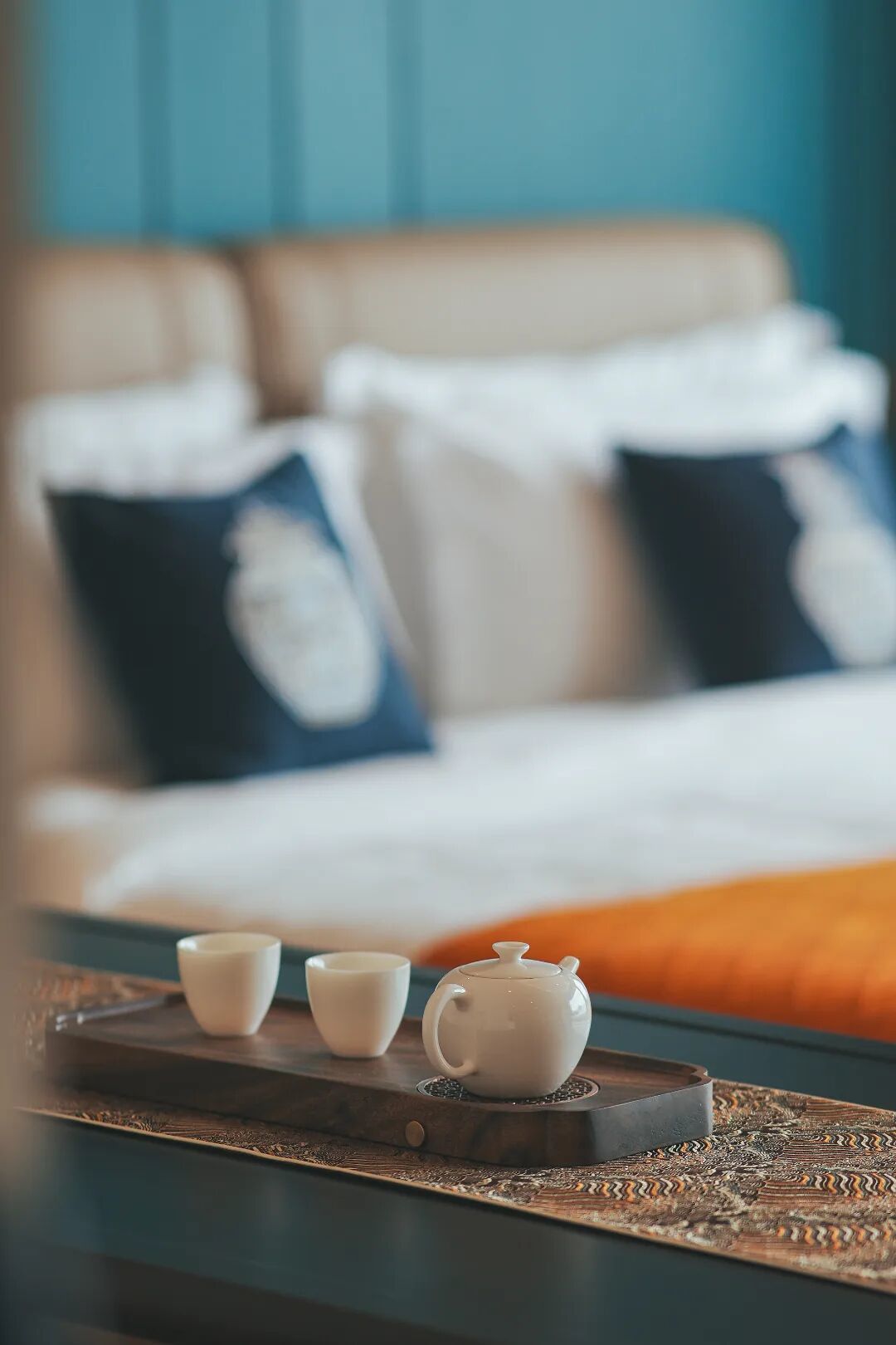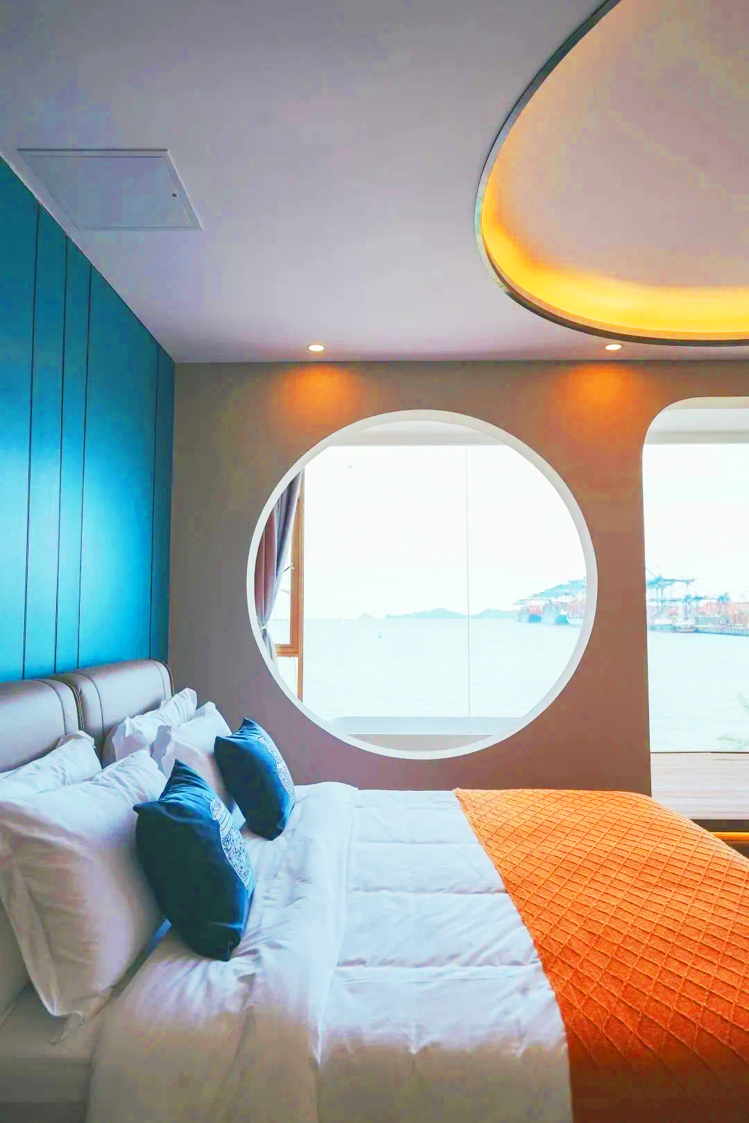 枕海浪声入眠、伴山海而醒,房间内无遮挡式的超大落地窗设计,分分钟将极致海景尽收眼底,克莱因蓝与爱马仕橙的强对比碰撞、让整个空间充满高级感。一器一物、一花一木更是充满“小心机”,清冷中藏着一丝暖意,也使整个空间灵动且活泼起来,悠然自得的格调,让人瞬间抽离现实,尽享浮世清欢。