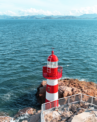 当经过略显曲折的工地段后,眼前便会豁然开朗:平缓的海岸、清澈见底的果冻海、摇曳的海藻群,还有那座标志性的红白灯塔在终点静候。