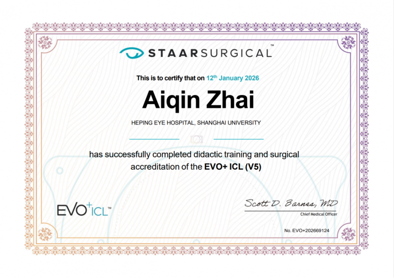 STAAR公司凌蓓经理表示,EVO+ ICL(V5)晶体在技术上实现两大革命性突破,将“高清视觉”的标准推向了新高度。此次‘临床应用合作中心’的授牌,标志着上海大学附属上海和平眼科医院在临床规范、技术实力与服务体系建设上于全国首批达到开展新一代V5技术的领先标准。三位专家同时获证,更是标志着上海大学附属上海和平眼科医院已建立起一支系统化、标准化、可规范开展V5晶体植入手术的骨干团队。