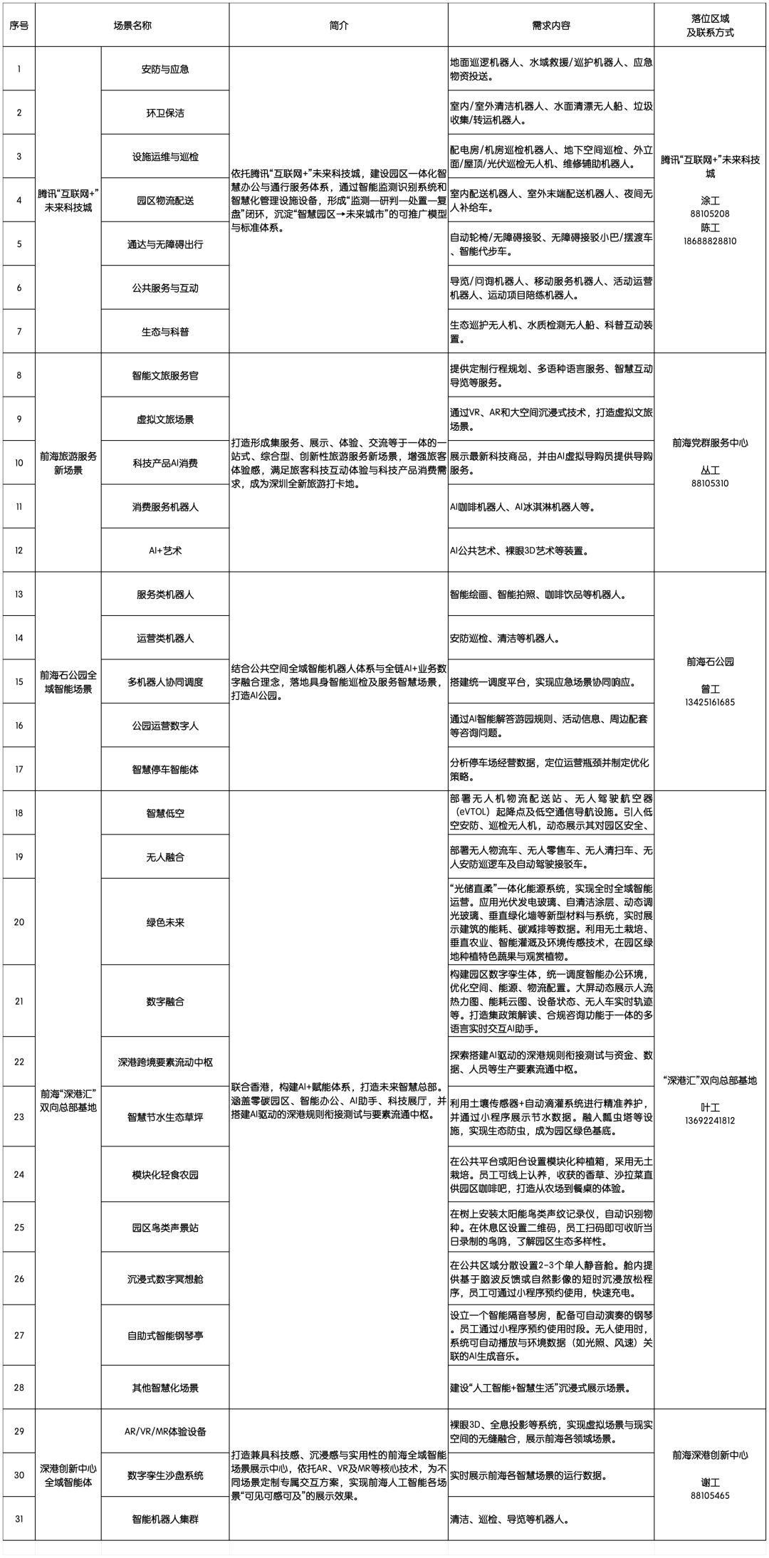 为进一步汇聚社会创新力量、深化应用场景合作,现面向社会公开发布腾讯“互联网+”未来科技城、前海旅游服务新场景、前海石公园全域智能场景、前海“深港汇”双向总部基地、深港创新中心全域智能体5个方面31项应用场景需求,诚邀各类市场主体、科研机构、行业组织积极关注、精准对接,提供满足场景需求的新技术新产品及切实可行的解决方案,共同构建前海应用场景创新矩阵。
