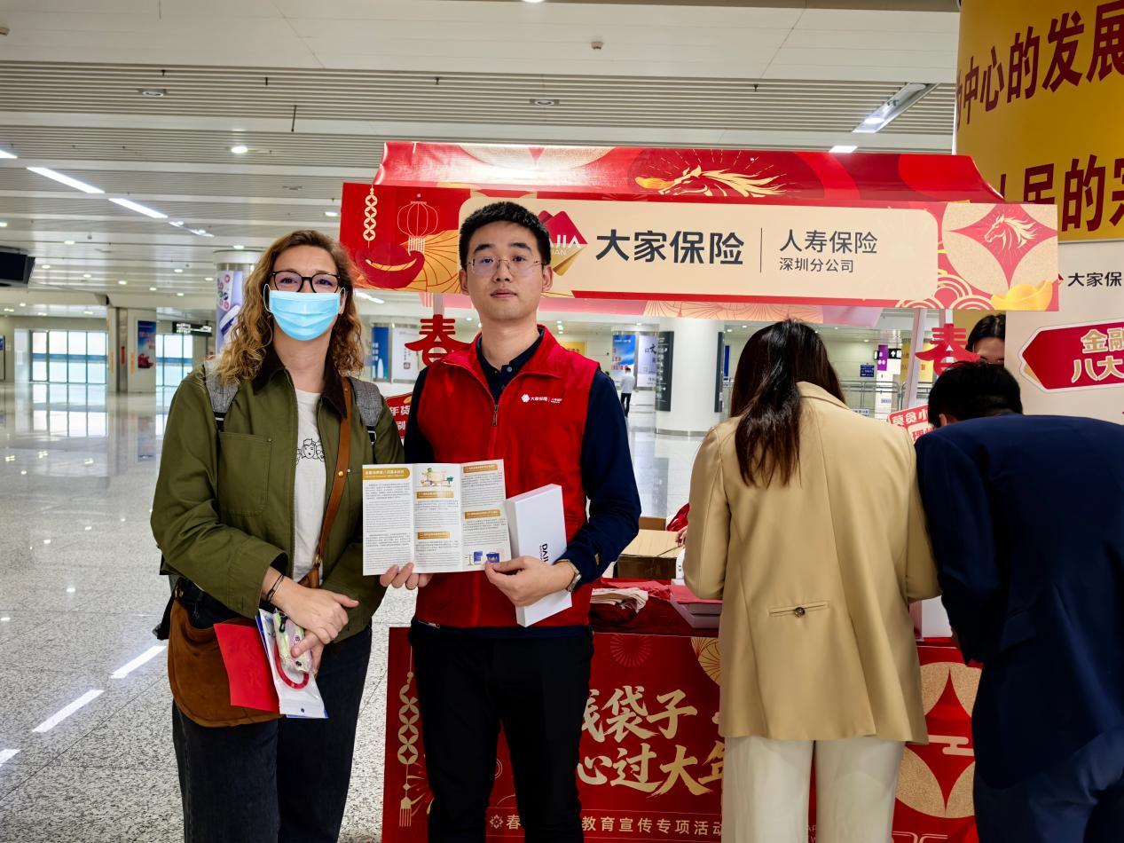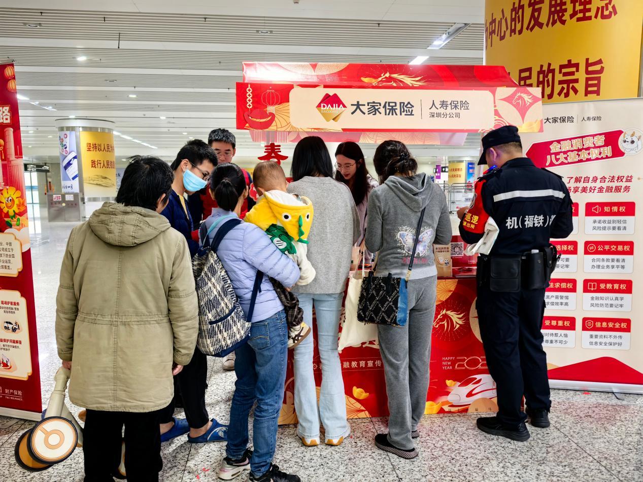 大家人寿深圳分公司全程参与、倾心助力。在公司宣传摊位前,工作人员发放《金融消费者八项基本权利》手册,为旅客讲解辨别诈骗套路、维护自身权益的实用技巧,让旅客既能收获实用知识,也能将安全理念带回家。工作人员还结合春运期间多发易发的金融诈骗案例,讲解防范非法集资、电信网络诈骗等方法,提升旅客反洗钱、防非反诈的意识和能力。