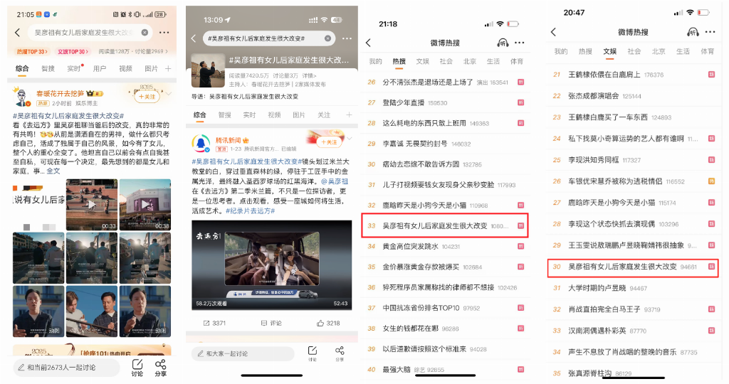 《去远方》第二季收获了超高评分与口碑,在腾讯视频端,观众为节目打出了9.9分的超高评分;节目话题热度表现同样亮眼:在播期间,《去远方》相关话题在微博上的阅读量突破3亿,总互动量超过10万,其中#吴彦祖有女儿后家庭发生很大改变 同时冲上微博主榜与文艺榜热搜,带来7000万话题阅读量;#吴彦祖聊到孩子笑成这样了 登上微博文娱榜,另有#吴彦祖就算老了也是法拉利 #吴彦祖说语言是文化的钥匙 等近10个破千万阅读话题登上微博实时热点,引发全网互动讨论。